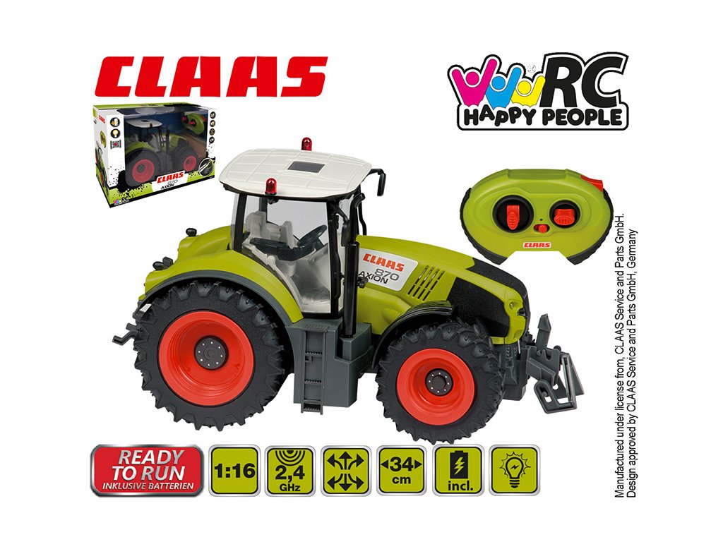 Traktor CLAAS je věrnou kopií skutečného traktoru. Má plnou funkci řízení a řazení. Funkční přední, zadní světla a otočná kola. Traktor je na dálkové ovládání s frekvencí 2,4 GHz. Traktor je na baterie 4xAA, ovladač 2xAAA. Baterie jsou součástí balení. Vhodné pro děti od 6 let.
