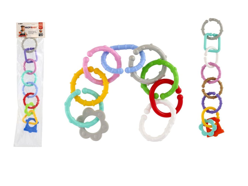 Plastový řetěz pro nejmenší. Řetěz je tvořen 8 dílky různých geometrických tvarů. Každý dílek má velikost 6 cm. Z jednotlivých částí je možné vytvořit krásný, různě dlouhý řetěz, přesně podle Vašich představ. Pestrobarevná hračka miminko okamžitě zaujme a zabaví na dlouhou dobu.