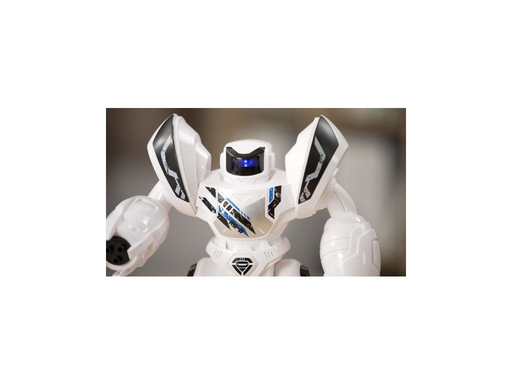 Robot na dálkové ovládání, který střílí náboje a může se naprogramovat na 20 akcí, velikost 30 cm. Vše je doprovázeno zvukovými i světelnými efekty (LED obličej).
