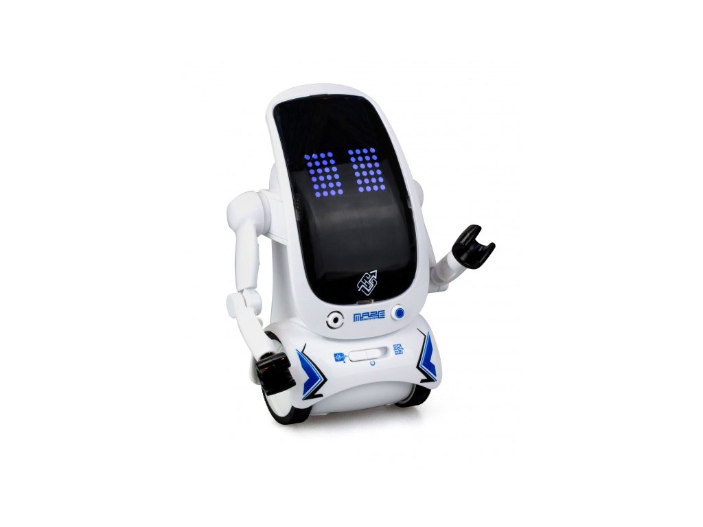 Robot s interaktivním obličejem, nahrává zvuk, playback, jezdí/chodí po označené cestě, velikost 17cm, app Silverlit