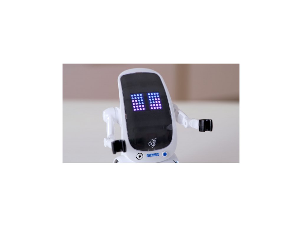 Robot s interaktivním obličejem, nahrává zvuk, playback, jezdí/chodí po označené cestě. Velikost 17cm. Zvukové efekty, 25 výrazů obličeje.