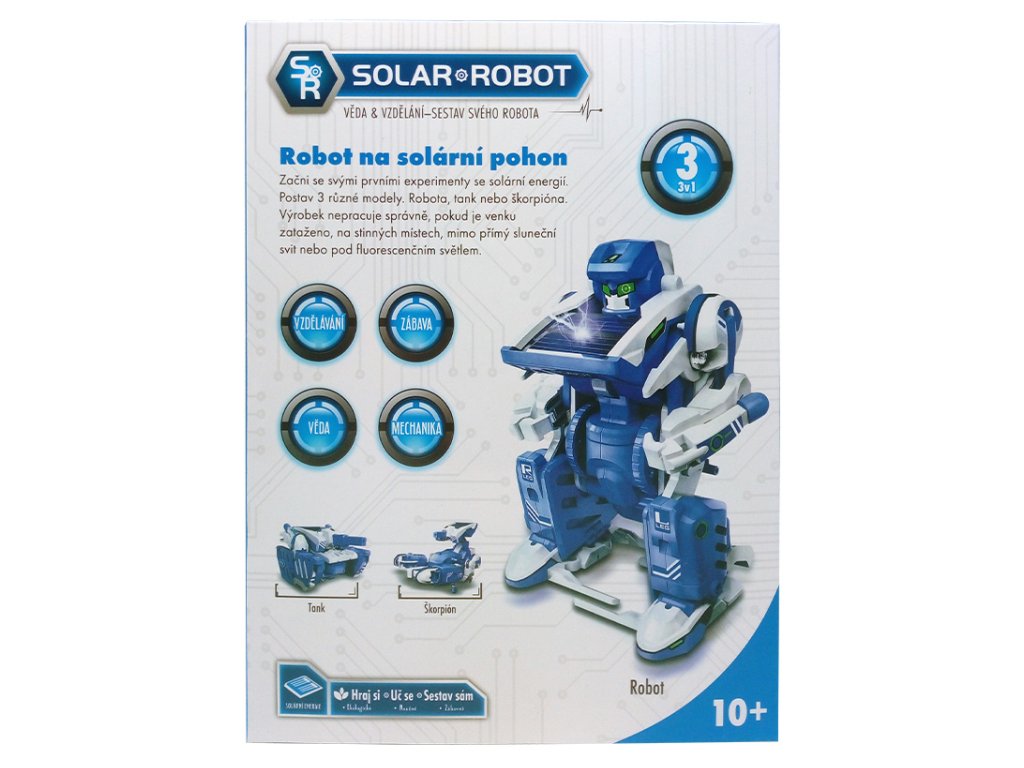 Solární stavebnice 3v1 Vaše dítě jistě zaujme. Při hraní si dítě cvičí prostorové vnímání a cvičí se v soustředění a trpělivosti. Obrovskou výhodou solární stavebnice 3v1 je její variabilita a funkčnost. Jednotlivé kousky se k sobě nepřilepují, tudíž můžete stavět znovu a znovu a vybírat si, zda postavíte dvounohého robota, tank nebo obrněného škorpiona. Součástí balení je podrobný návod, se kterým nebude mít problémy ani malý kluk.