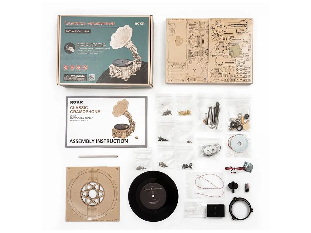 Jak zní historie? Stavebnice gramofonu z překližky. Retro designem, inspirovaným gramofonem vynalezeným Thomasem Edisonem, Vás přenese do 19. století. Není to jen model, skutečně umí přehrávat desky a je k němu i dodávána 7" gramodeska obsahující trojici písní (The Merry Gent, Memory Of A Dance, The Giant Killers). Zařízení disponuje ručně, klikou, poháněnou mechanikou a dynamem. Je možné jej ale pohánět i elektricky, pomocí vestavěného micro-USB konektoru. Podporuje desky o rozměrech 17,5 cm (7") a 25 cm (10") a všechny jim odpovídající rychlosti přehrávání. Hlasitost reprodukce lze upravovat pomocí otočného ovladače. Jedinečný dárek pro všechny milovníky kutilství a hudby, ale také luxusní interiérová dekorace do pokoje či kanceláře. Skládačka je dodávána v nesloženém stavu, balena v krabici. Vybaveno detailním návodem k sestavení. Hlavní vlastnosti:gramofon a 7" gramodeska424 precizně vyřezaných dílkůvysoká obtížnost sestaveníruční pohon nebo pomocí micro-USBdodávaná gramodeska obsahuje písně:The Merry GentMemory Of A DanceThe Giant Killers