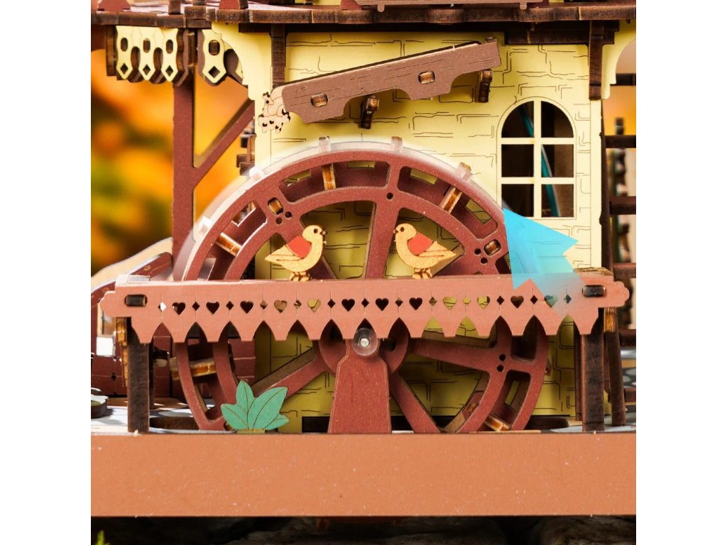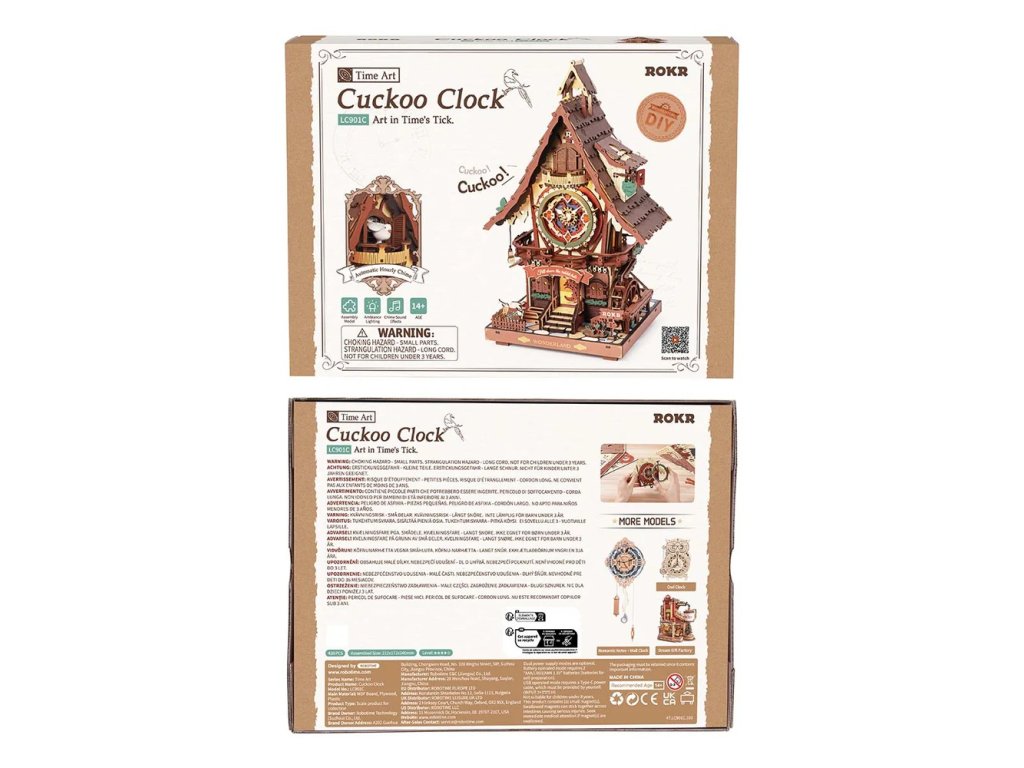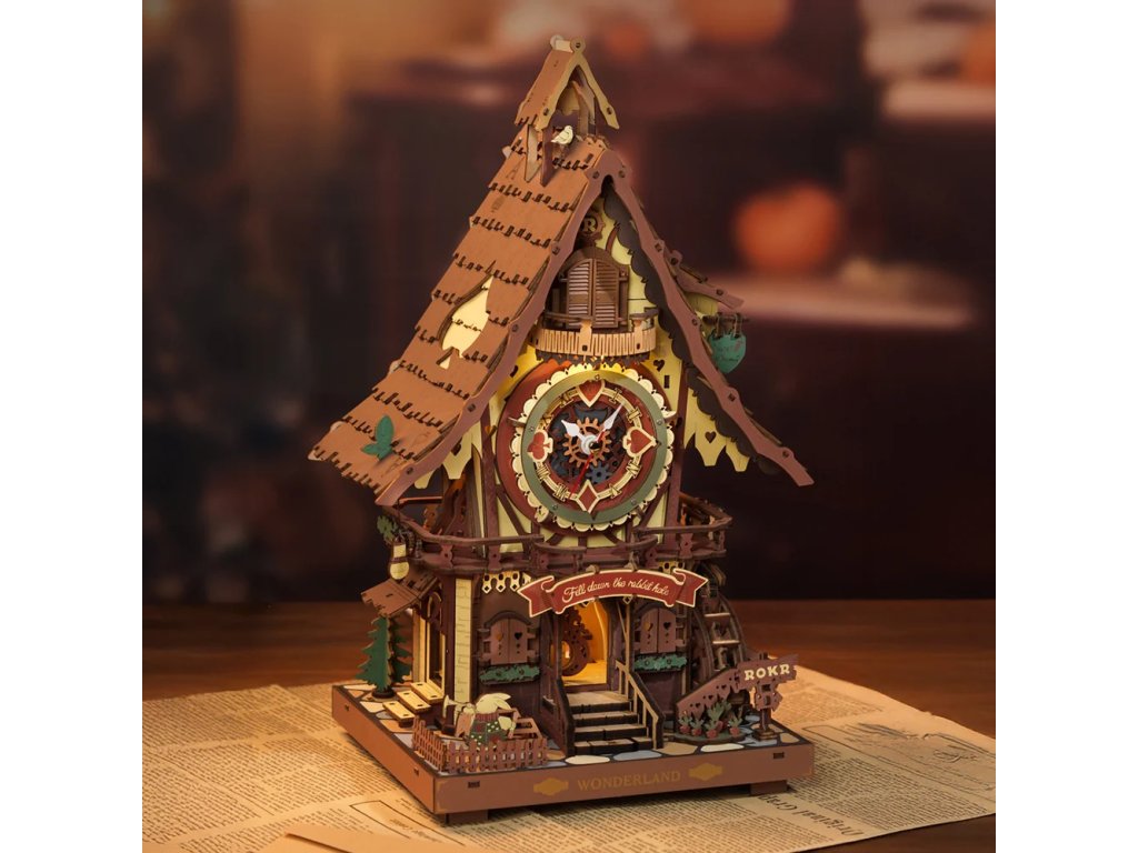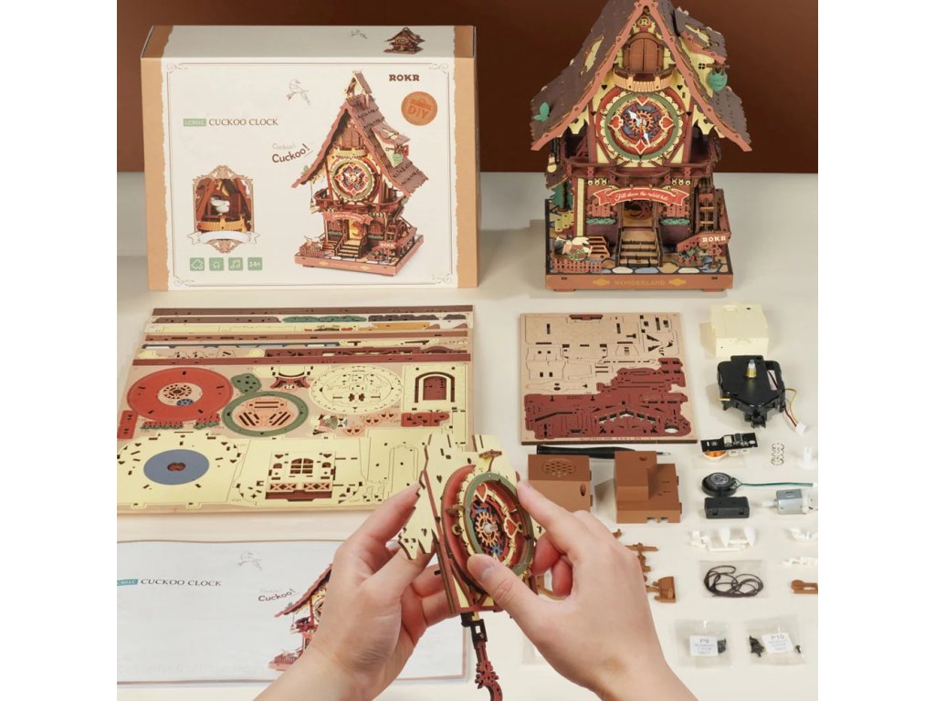 Kukačkové hodiny jako z pohádky! Ukazují přesný čas, okouzlí Vás hravými detaily a přinášejí krásu tradičního řemesla. Představují lesní chaloupku ukrytou v kouzelném lese, doplněnou točícím se vodním kolem, dřevěným plotem a zahrádkou. Hodiny mají kukačku, kyvadlo ve tvaru půlměsíce, doškovou střechu a mnoho dalších prvků. Mezi hravé detaily patří symboly karetních motivů na střeše i ciferníku. Skrytý přepínač jako součást schodů umožňuje spustit zvuk kukačky nebo nastavit hodinový zvukový režim. Po zapnutí hodinového režimu vykoukne každou celou hodinu veselá kukačka z okénka, roztáhne křídla a zazpívá jemnou melodii. Zvuk kukačky a hodinový mechanismus jsou elektronicky propojeny. Skládačka využívá quartzový strojek řízený křemenným krystalem, který zajišťuje vysokou přesnost. Časový signál z hodinového strojku je spolehlivě přenášen do mechanismu kukačky. Teplé tóny osvětlení prozáří každý kout a vytvoří kouzelnou pohádkovou atmosféru. 3D skládačka je skvělý způsob, jak si užít kreativní a edukativní hraní a zároveň vytvořit nádherný model květiny, který se může stát netradičním dárkem či ozdobou Vašeho domova či kanceláře. Skládání podporuje rozvoj jemné motoriky, prostorového myšlení a trpělivosti. Je to možnost, jak kombinovat zábavu se vzděláváním. Skládačka je vyrobena z kvalitního, udržitelně získaného dřeva a ošetřena moderní technologií barvení pro maximální věrnost detailů. Je dodávána v nesloženém stavu, zabalená v krabici s podrobným návodem k sestavení. Hlavní vlastnosti: 435 dílkůdoba skládání 6 hodins osvětlením a se zvukemk napájení slouží 3x baterie AAA nebo USB-C kabel (nejsou součástí balení) vysoká obtížnost sestavení bez použití lepidlavýjimečný a realistický vzhledvhodné pro děti i dospělérozvíjí logické a motorické dovednostipodporuje trpělivost dětíideální dárek nebo jedinečná dekorace
