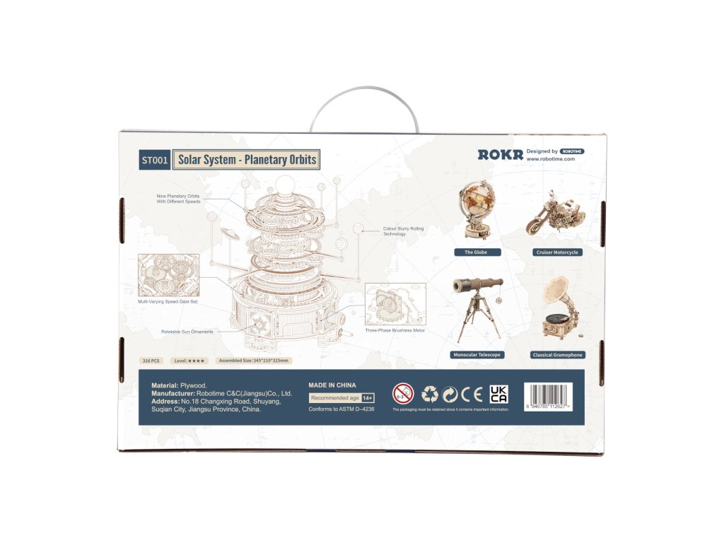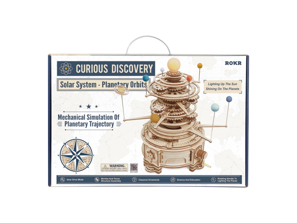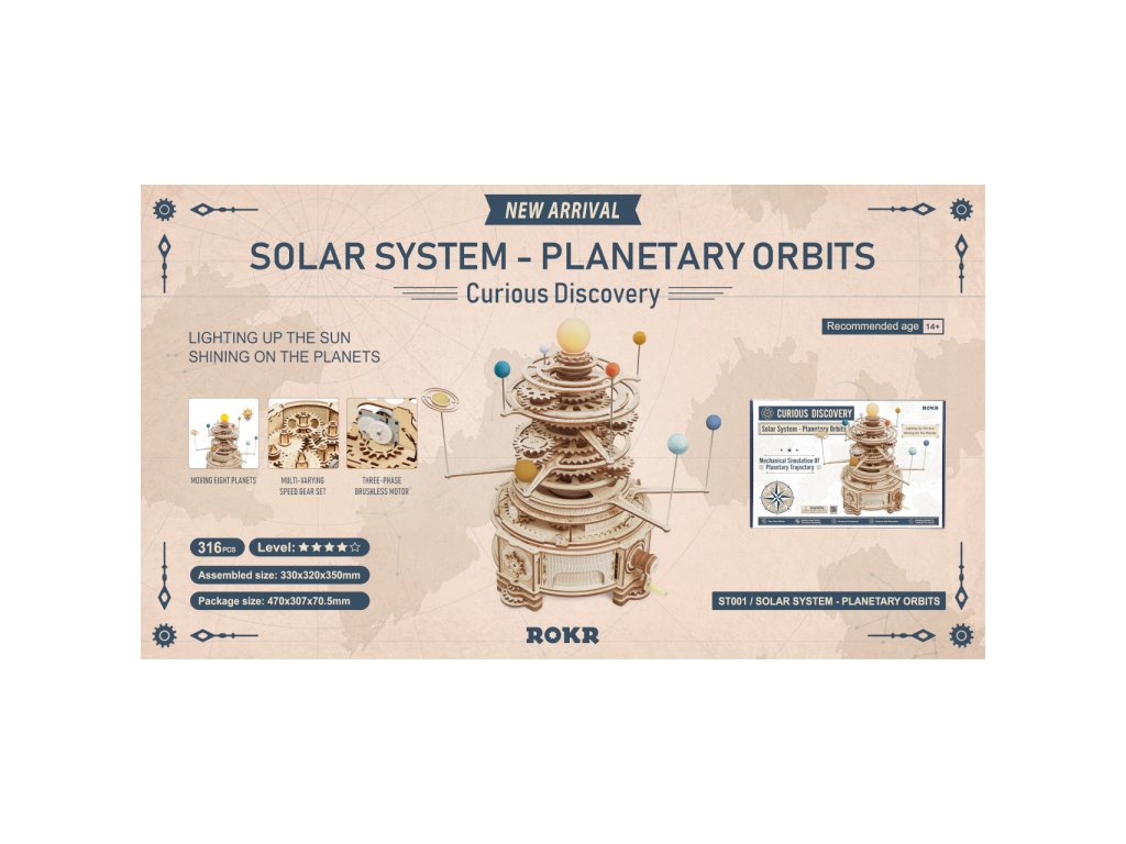 Prozkoumejte Sluneční soustavu se stavebnicí planetária z překližky. Jeho stavba představuje výzvu, která podněcuje zvědavost a můžete při ní rozvíjet své dovednosti. Po sestavení je možno obdivovat osm planet obíhajících různou rychlostí Slunce ve středu modelu. Mechanismus je navíc opatřen dynamem, díky kterému Slunce při otáčení klikou skutečně svítí, a vnáší tím do pohybu neopakovatelnou atmosféru. Planety jsou vyvedeny v pestrých barvách, vyrobeny z odolné buničiny. Pohání je soustava převodů navržená s důrazem na vždy dokonale hladký a plynulý chod. Hotový model vybízí k využití jako názorná učební pomůcka pro děti, ale dovedně také zkrášlí poličku, nebo malý stolek, a zútulní tak pokoj každého fanouška astronomie. Skládačka je dodávána v nesloženém stavu, balena v krabici. Vybaveno detailním návodem k sestavení. Hlavní vlastnosti:316 precizně vyřezaných dílkůvysoká obtížnost sestavenídynamem poháněný světelný efekt