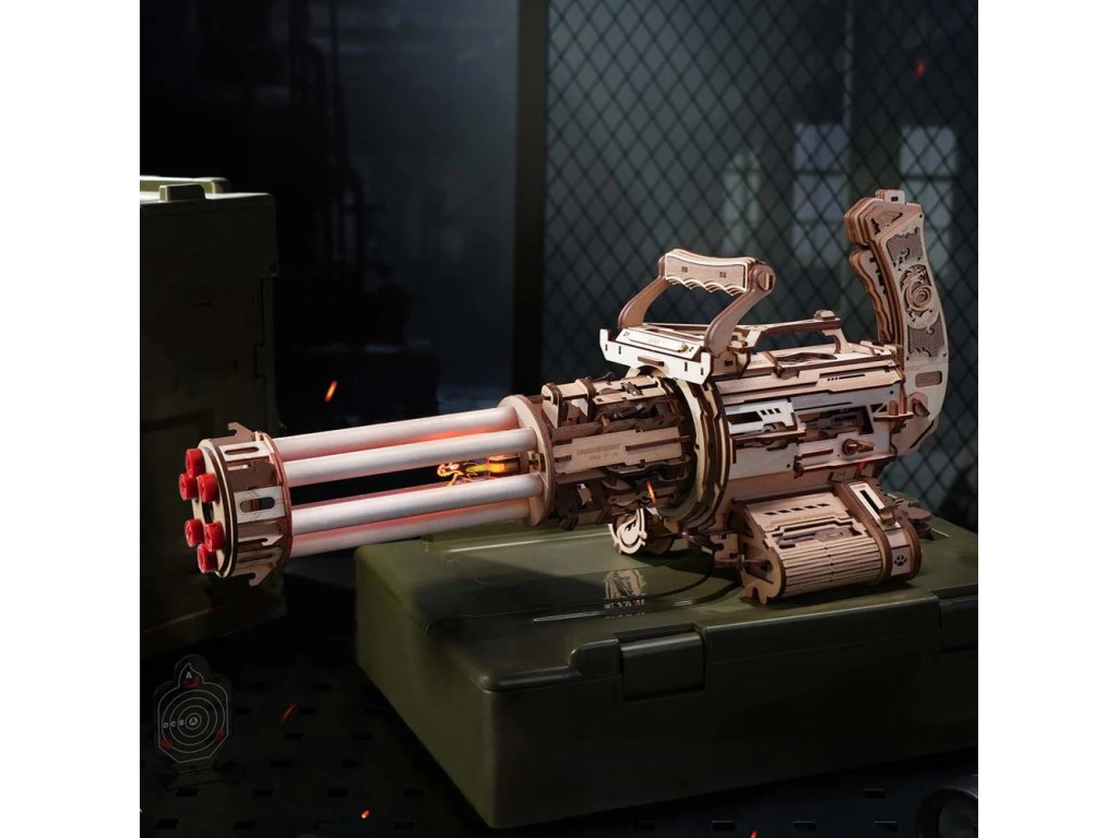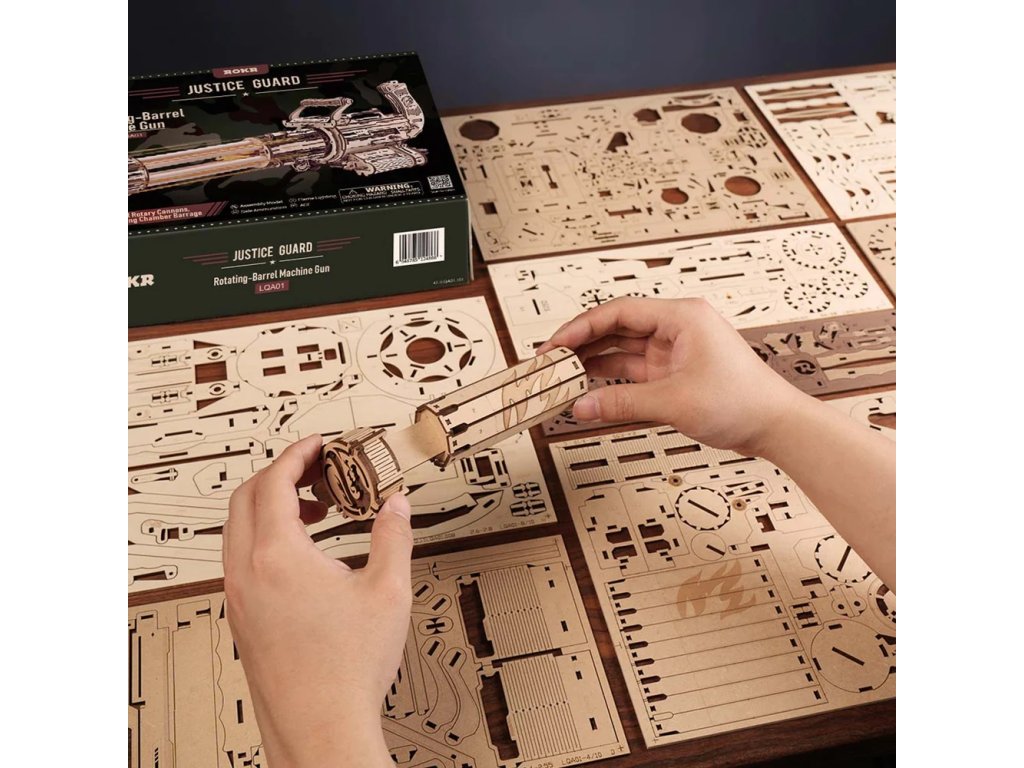 Připravit, sestavit, zaměřit, střílet! Rozprouděte si krev. Máte dostatek adrenalinu pro tuto otočnou, cvakající a střílející obouruční zbraň? Kulomet s otočnou hlavní ROKR je 3D dřevěná puzzle zbraň, jejímž vrcholem je šest otočných hlavní, z nichž každá dokáže vystřelit šest gumiček. To je 36 vysokorychlostních ran, které můžete nabít na odnímatelnou sestavu otočné hlavně. Tato kráska, inspirovaná modelem XM556, naučí fanoušky leccos o mechanice rotačních kulometů, aniž by přitom měla masivní hmotnost. Také se vyhýbá zranění živých cílů tím, že jako střely používá gumičky. Staňte se svým vlastním akčním hrdinou a objednejte si ten svůj ještě dnes! Tato stavebnice technického modelu je skvělým prvkem v jakékoli sbírce, ať už jde o vystavení nebo jako dárek pro nadšence do hraček a filmů či vojenské veterány po celém světě. Šestihlavňový kanón má jednoosý synchronizovaný systém řízení palby, který jako munici používá gumové pásy. Každá ze šesti hlavní pojme šest gumových pásů pro celkem 36 výstřelů, poháněných účinným převodovým mechanismem. Pro rovnoměrné napnutí a plynulou střelbu vkládejte munici jednu po druhé a otáčejte hlavní, dokud všechny hlavně nebudou mít 6 gumiček. Přední spoušť otáčí hlavní a světlem ohnivého draka, zatímco horní spoušť spouští gumičky pro dvojnásobnou zábavu a akci. Hlavní vlastnosti: 412 přesných dílkůsnadná montáž bez použití lepidlatěžká obtížnost sestavenírychlý, ale bezpečný systém střelby36 rychlopalných střelodnímatelná hlaveňjedinečný dekorační prvekvhodné jako sběratelský prvek