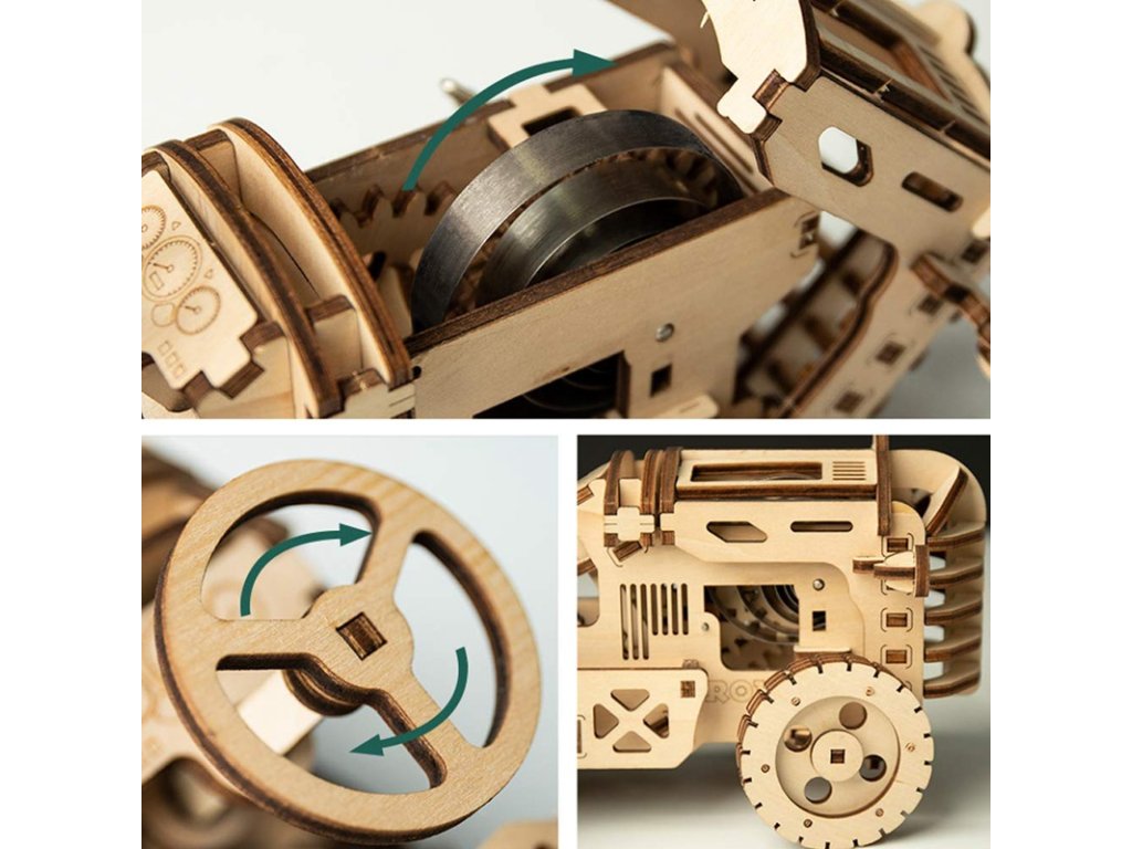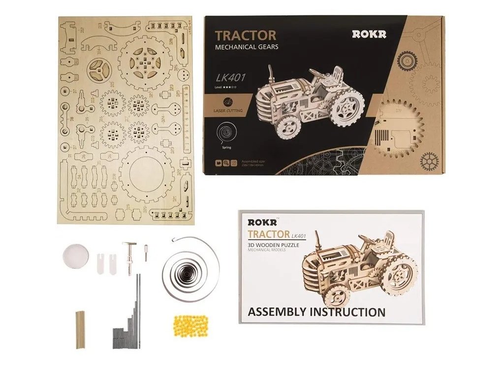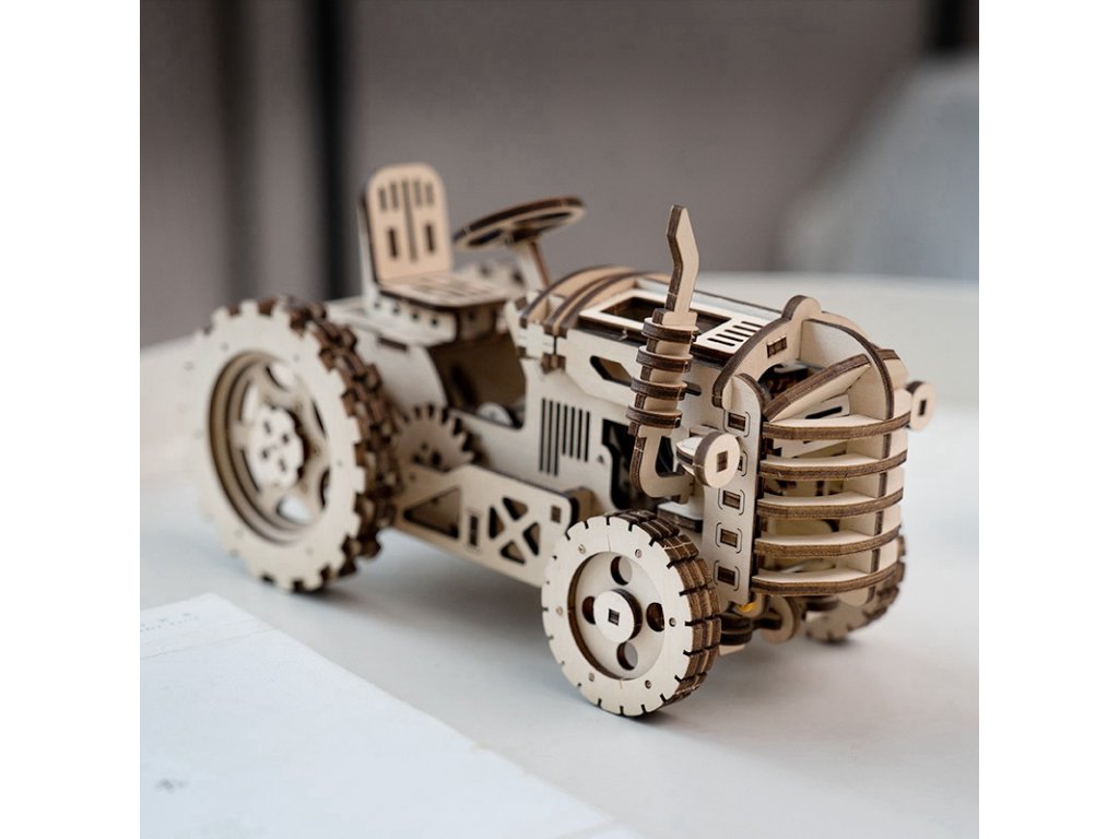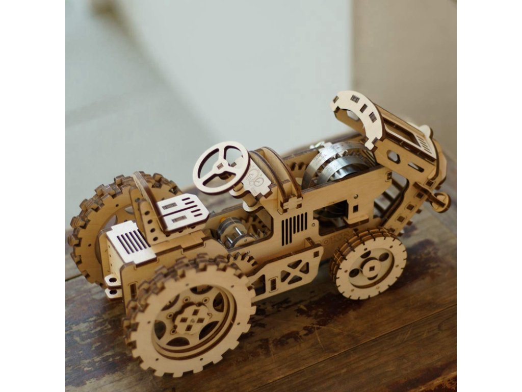 Nechte se odvézt do širých polí, daleko od chaosu a ruchu. Stavebnice traktoru z překližky. Jedná se o robustní a odolné vozidlo vybavené natahovacím pružinovým pohonem, schopné samostatné jízdy. Kapotu lze odklápět a pozorovat pohyb převodového soukolí. Otáčením volantu můžete měnit směr jízdy. Model zdobí realistické detaily, jako je sedadlo nebo výfuk. Skládačka je dodávána v nesloženém stavu, balena v krabici. Vybaveno detailním návodem k sestavení. Hlavní vlastnosti:135 precizně vyřezaných dílkůstřední obtížnost sestavenívýsledný model je řiditelný a schopný samostatné jízdy