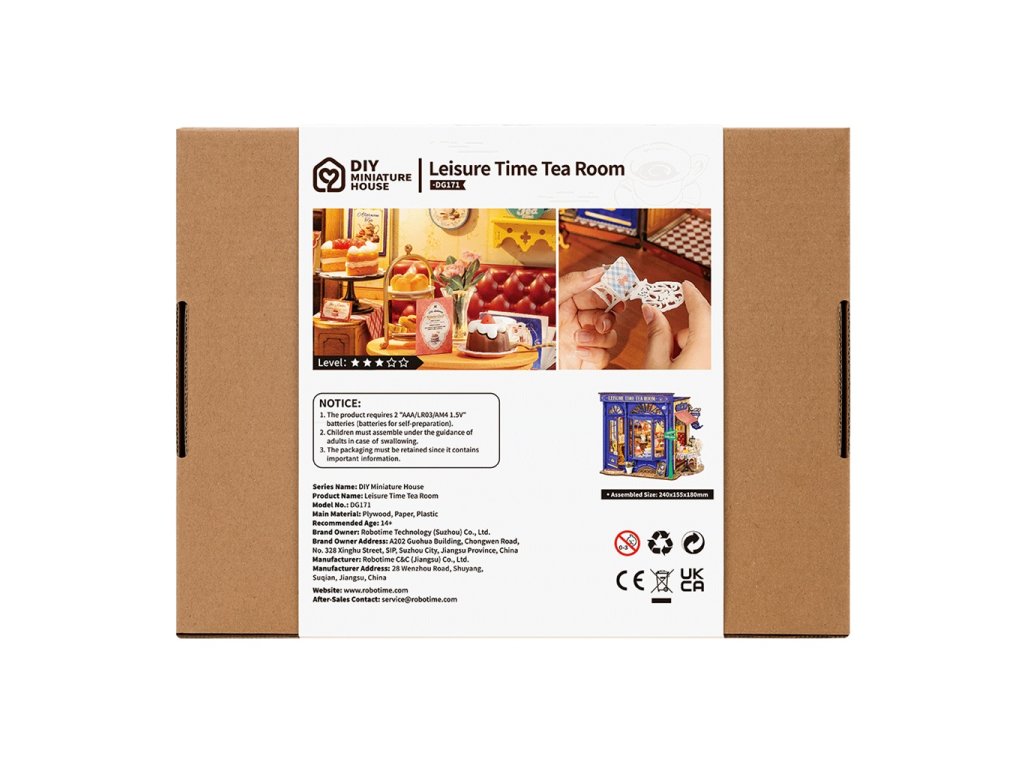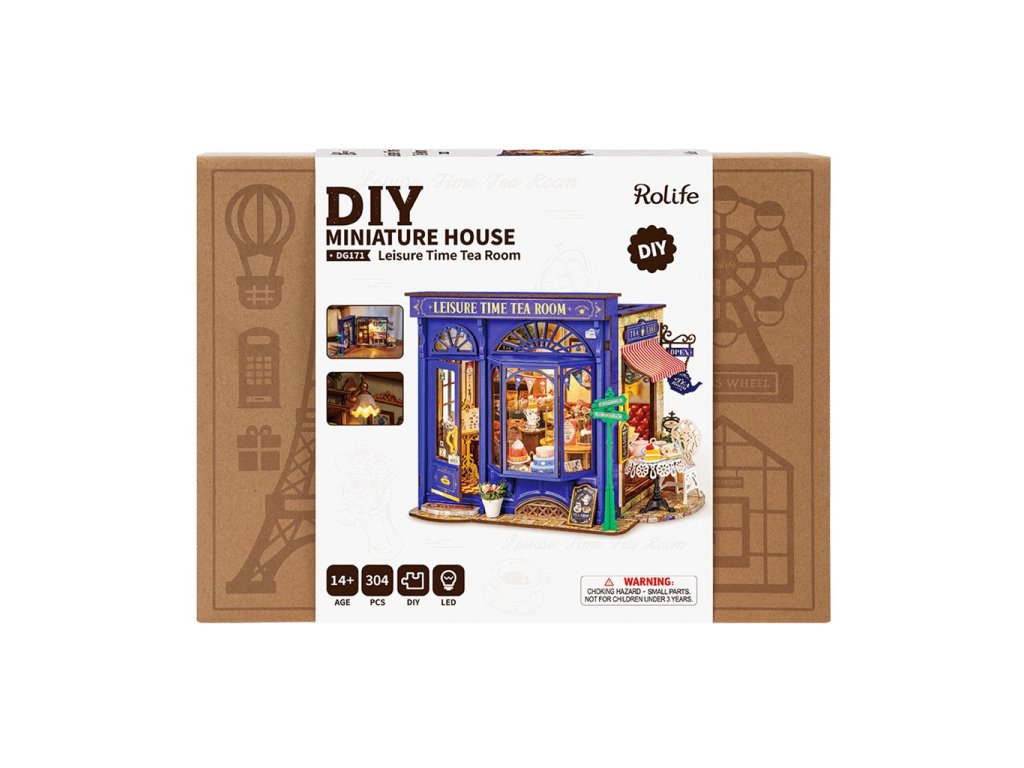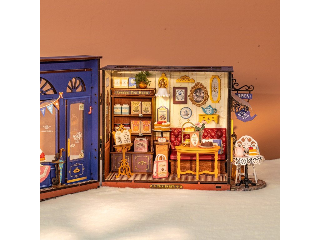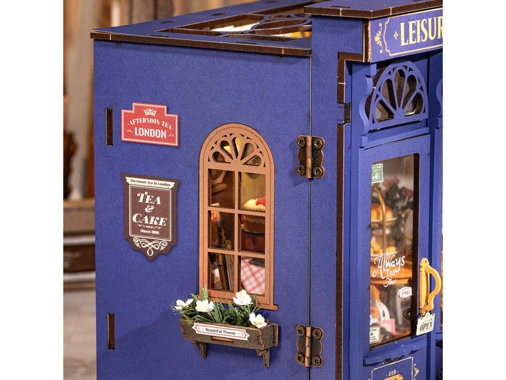 Cítíte tu vůni? Otevřete zářivě modré dveře a vejděte do anglické čajovny ve vintage stylu někde v Londýně. Usaďte se na prošívanou červenou koženou sedačku a vyberte si z menu. Dáte si lahodný koláč, pudink či dort? Nebo si raději vychutnáte šálek pravého anglického čaje venku u stolečku a budete sledovat, co se kolem děje? Přečtěte si nabídku dobrůtek pod osvětlením krásné nástěnné lampy ve tvaru květiny. Čajovna je propracována do nejmenších detailů jako dlažba, rustikální kovové cedule, plechovky s čajem, sklenice džemu či květiny na stole. Vychutnejte si atmosféru klidu a pohody, která je umocněna příjemným LED osvětlením. 3D skládačka je skvělý způsob, jak si užít kreativní a edukativní hraní a zároveň vytvořit nádherný model, který se může stát netradičním dárkem či ozdobou interiéru. Skládání 3D skládačky podporuje rozvoj jemné motoriky, prostorového myšlení a trpělivosti. Je to možnost, jak kombinovat zábavu se vzděláváním. Všechny přesně vyřezané dílky do sebe lehce zapadnou bez použití lepidla či nástrojů, aby výsledek byl stabilní a odolný. Skládačka je dodávána v nesloženém stavu, zabalená v krabici s podrobným návodem k sestavení. K napájení slouží 2x AAA /LR03/AM4 1,5 V (nejsou součástí balení). Hlavní vlastnosti: 304 dílkůdoba skládání 6 hodstřední obtížnost sestaveníLED osvětlenísestavení bez použití lepidla a nástrojůvýjimečný vzhledvhodné pro děti i dospělérozvíjí logické a motorické dovednostipodporuje trpělivost dětíideální jako dárek nebo jedinečná dekoracenapájení pomocí 2x AAA /LR03/AM4 1,5 V (nejsou součástí balení)
