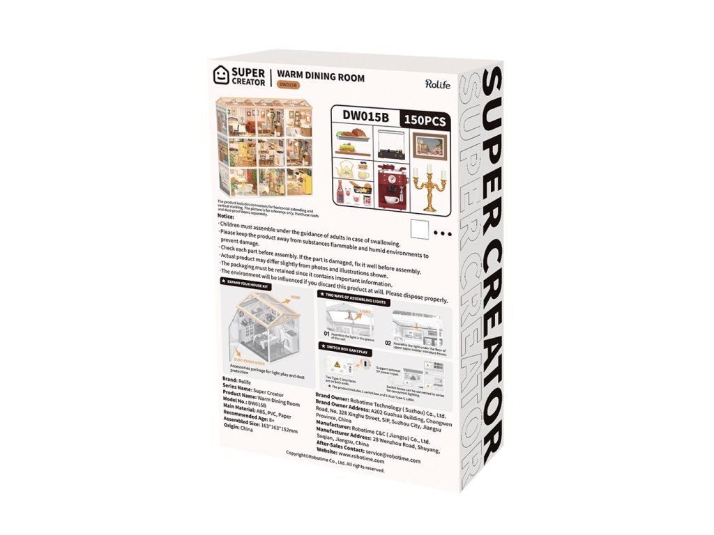 Kuchyň a jídelna jsou srdcem domova. U jídelního stolu se potkáváme se svými nejbližšími a u jídla si povídáme o životě, novinkách, svých zážitcích. Den začínáme šálkem kávy nebo čaje a snídaní a u jídelního stolu v kruhu rodiny náš den končí. Tento útulný jídelní kout v elegantním vintage stylu v krémové barvě s prostorným jídelním stolem je zobrazen do nejmenších detailů. Najdete zde příborník, stůl pokrytý ubrusem se 4 židlemi, pečivo, talířky, hrnečky, kávovar a další doplňky, které navozují atmosféru klidu a rodinné pohody, jako jsou obrázky na zdech, svícen či gramofon. Spojením různých miniatur řady Super Creator Series vertikálně nebo horizontálně můžete vytvořit různorodý komplex domečků. Ochraňte svůj výtvor pomocí krytů proti prachu a nečistotám – DWP05 Dveře proti prachu B a DWP02 Střecha typu B. Skládání skládačky podporuje rozvoj jemné motoriky, prostorového myšlení a trpělivosti. Je to možnost, jak kombinovat zábavu se vzděláváním. Všechny přesné dílky do sebe lehce zapadnou, aby výsledek byl stabilní a odolný, a to bez použití lepidla. Skládačka je dodávána v nesloženém stavu, zabalená v krabici s podrobným návodem k sestavení. Hlavní vlastnosti: 150 dílkůdoba skládání 45 minLED osvětleník napájení slouží kabel USB-C (je součástí balení)sestavení bez použití lepidlaatraktivní vzhledvhodné pro děti i dospělérozvíjí logické a motorické dovednostipodporuje trpělivost dětíideální jako dárek nebo jedinečná dekoracemožnost spojení více miniaturk dokoupení kryty proti prachu – DWP05 a DWP02