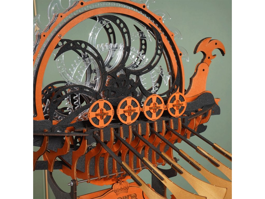 Přeneste se do historie s modelem Dračí lodě inspirovaným starými vikingskými plavidly zvanými drakkar, což znamená drak. Věřilo se, že drak chrání námořníky během plavby. Dlouhá, úzká konstrukce lodí umožňovala rychlost a hbitost v manévrování. Vikingové jsou známí hlavně jako divocí nájezdníci nebo dobyvatelé. Tato složitě navržená plavidla ale odhalují jejich pokročilé dovednosti ve stavbě lodí a jejich schopnost plavit se na obrovské vzdálenosti. Skládačka je vybavena mechanismem, který zajišťuje synchronizovaný rotační pohyb všech vesel. Nad celou lodí prochází prosvětlená plastová dračí páteř, která je výraznější díky třpytivému efektu a syté barvě. Skládačka umožňuje užít si kreativní a edukativní hraní a zároveň vytvořit nádherný model s LED osvětlením, který se může stát netradičním dárkem či ozdobou interiéru. Skládání 3D skládačky podporuje rozvoj jemné motoriky, prostorového myšlení a trpělivosti. Pozvěte svou rodinu nebo přátele a užijte si zábavné tvoření bez nutnosti použití lepidla nebo nástrojů. Všechny díly skládačky jsou přesně vyřezané a očíslované a lehce do sebe zapadnou, aby výsledek byl stabilní a odolný. Skládačka je dodávána v nesloženém stavu, zabalená v krabici s podrobným návodem k sestavení a k napájení slouží USB-C kabel (není součástí balení). Hlavní vlastnosti: 229 dílkůdoba skládání 4 hodstřední obtížnost sestavenírozvíjí logické a motorické dovednostisnadná montáž bez použití lepidla a nástrojůpodporuje trpělivost dětíideální jako dárek nebo jedinečná dekoracepodrobný návod k sestavení součástí balenínapájecí kabel USB-C není součástí baleníLED osvětlení