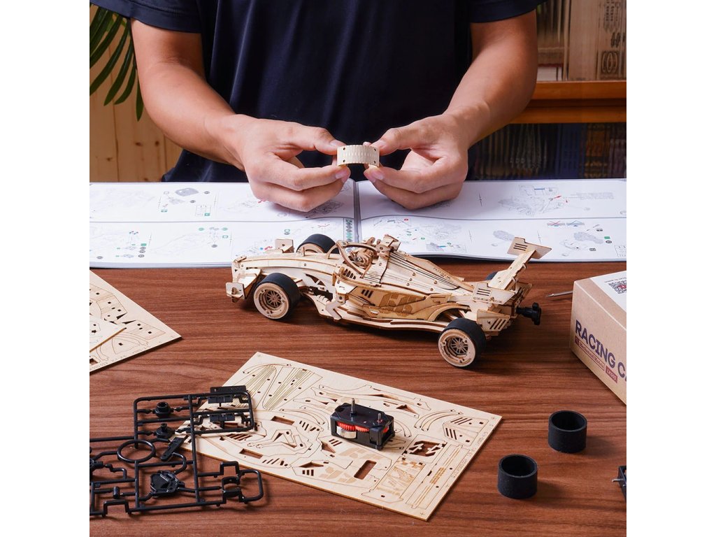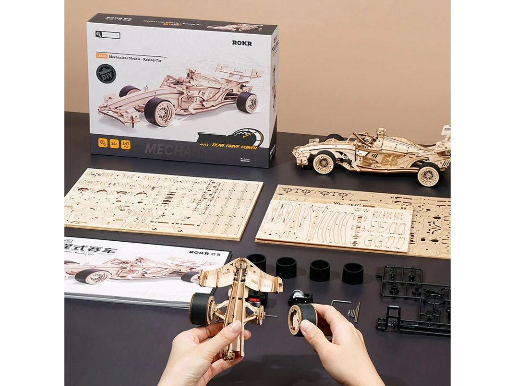 Připravte se na vzrušující jízdu na palubě závodního auta! Skládačka inspirovaná formulí F1 Vám zaručeně zvedne tlak a je ideální pro automobilové nadšence. Závodní auto má aerodynamický tvar, je realisticky propracované do nejmenších detailů, jako je dřevěný rám, zadní spoiler, špičatá příď, nízká světlá výška, kokpit s řidičem, odhalená mechanická ozubená kola a součásti motoru představující planetární převodový systém, který zajišťuje plynulé zatáčení a pohyb kol diferenciálu, zejména když se robustní silikonová kola setkají s překážkami. Převodová skříň napodobuje zvyky motoru skutečné formule F1. Toto auto nepotřebuje baterie! Stačí je natáhnout klíčem a sledovat, jak se blíží k cílové pásce. Je schopné ujet 6 až 8 metrů a poloměr otáčení činí 40 cm. Skládání 3D skládačky podporuje rozvoj jemné motoriky, prostorového myšlení a trpělivosti. Pozvěte svou rodinu nebo přátele a užijte si zábavné tvoření bez nutnosti použití lepidla nebo nástrojů. Všechny díly skládačky jsou přesně vyřezané a očíslované a lehce do sebe zapadnou, aby výsledek byl stabilní a odolný. Skládačka je dodávána v nesloženém stavu, zabalená v krabici s podrobným návodem k sestavení. Jak uvést auto do pohybu: 1. Natáhněte dostatečně pružinu klíčkem ve tvaru T.2. Zatlačením na helmu řidiče se auto rozjede.3. Pro brzdění stiskněte tlačítko na spodní straně. Hlavní vlastnosti: 246 dílkůdoba skládání 4 hodujede 6 až 8 metrů nevyžaduje bateriesnadná montáž bez použití lepidla a nástrojůstřední obtížnost sestavenírozvíjí logické a motorické dovednostipodporuje trpělivost dětíideální jako dárek nebo jedinečná dekoracepodrobný návod k sestavení součástí balení