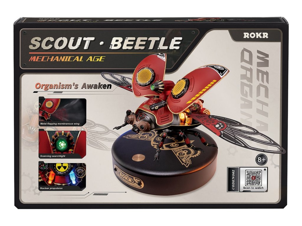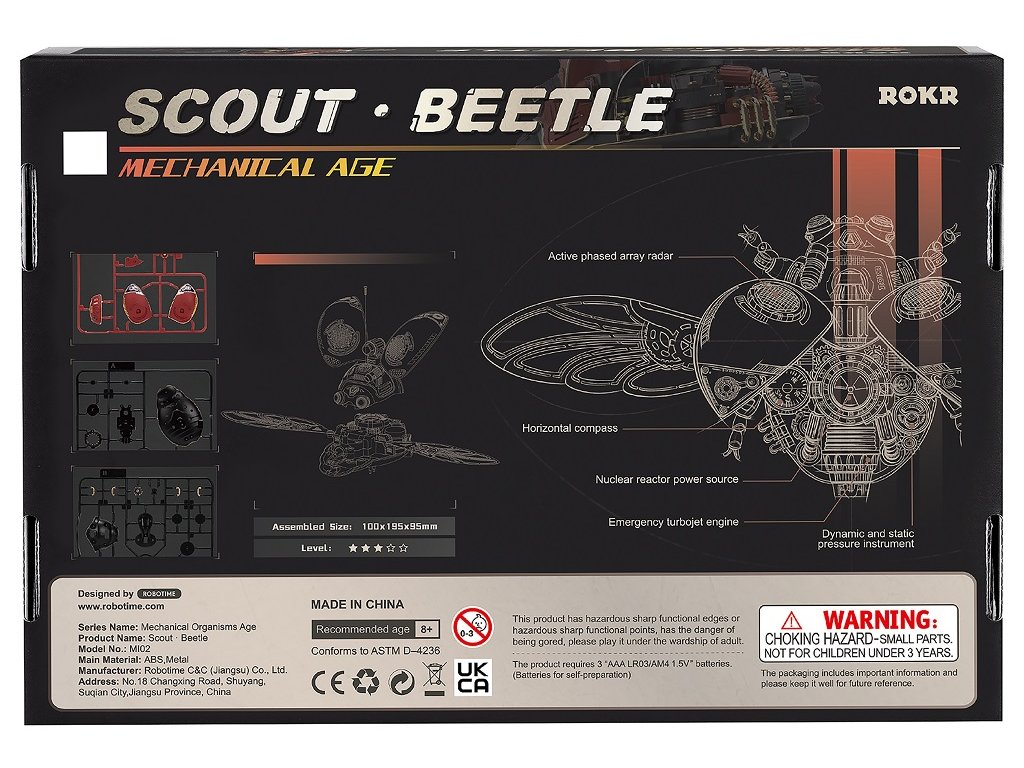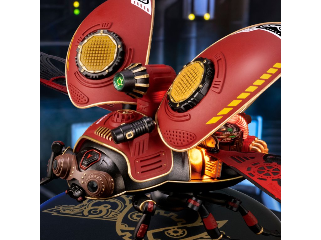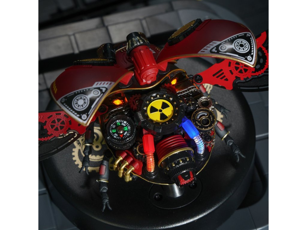 Originální mechanický brouk je připraven k průzkumnému letu! Nechejte se okouzlit atraktivním provedením a výbavou. Při jeho sestavování prověříte svůj důvtip, trpělivost a zručnost. Až budete s prací hotovi, můžete obdivovat, jak mává křídly a osvětluje okolí ve snaze vyhnout se nebezpečí. Na poličkách fanoušků science fiction a steampunku se bude zvláště vyjímat! Stavebnice kombinuje detailně zpracované plastové a kovové díly, které jsou pečlivě nalakované a potištěné. Obsahuje bateriově (baterie nejsou součástí balení) napájený pohon a LED osvětlení. Hotový model lze spouštět a vypínat pomocí dotekového ovládání umístěného v základně. Dodáváno v nesloženém stavu, baleno v krabici. Vybaveno detailním návodem k sestavení. Hlavní vlastnosti:poutavé provedení z kovu a plastumotorem poháněná křídla, LED osvětlení (3×AAA baterie nejsou součástí balení)147 dílů celkemstřední obtížnost sestavení
