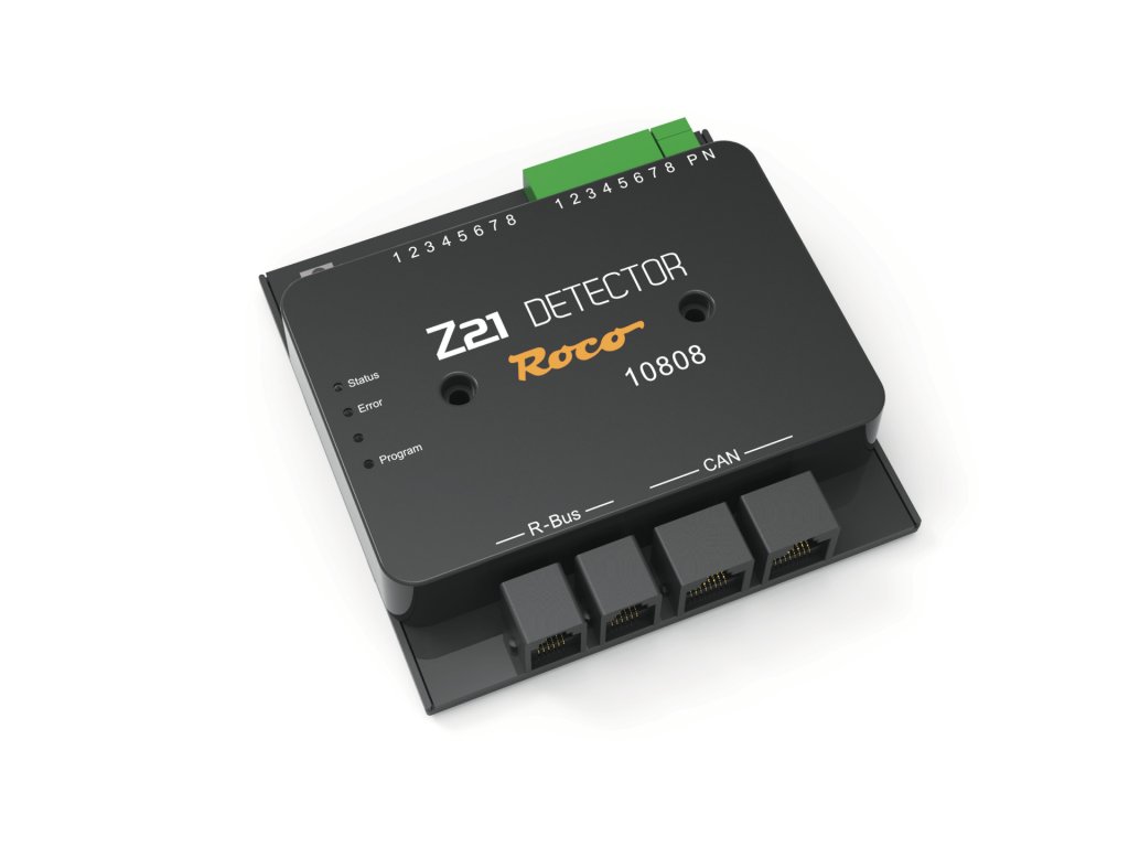 Detektor Roco Z21 Detector je zařízení určené pro modelové železnice se systémem Z21, které slouží k zpětnému hlášení obsazenosti kolejových úseků. Modul sleduje proud v osmi oddělených úsecích kolejí a přenáší informace o jejich obsazenosti do centrály přes R-BUS nebo CAN-BUS. To výrazně usnadňuje automatizaci a monitorování provozu, zejména v rozsáhlejších nebo méně viditelných částech kolejiště. Díky podpoře RailCom® lze s CAN-BUS propojením detekovat také adresu lokomotivy v každém úseku.Detektor je možné snadno nakonfigurovat pomocí integrovaného programovacího tlačítka nebo softwaru, a každý vstup má svou stavovou LED diodu pro přehledné zobrazení obsazených úseků. Tento modul je určen pro digitální řízení s centrálními jednotkami Z21 a je velmi vhodný pro automatizaci, signalizaci a řízení vlaků v komplexnějších kolejištích. Modul je nezávislý na měřítku a je určen pro digitální modelové železnice různých velikostí. Rozhodující je typ provozu a elektrické parametry, nikoli měřítko. Specifikace: Typ zařízení: Detektor obsazenosti kolejíPočet vstupů: 8 sekcíDetekce: měření proudu a RailCom® detekceRozhraní: R-BUS, CAN-BUSPodpora systémů: DCC a Motorola (MM)Vstupní napětí: 12–24 V DCC / MMMaximální vstupní proud: 4,1 AVýstupní proud na kanál: až 3 ARozměry: přibližně 104 × 104 × 25 mm Hlavní vlastnosti: zpětné hlášení obsazenosti až 8 kolejových sekcí pomocí proudové detekce RailCom® detekce umožňuje identifikovat lokomotivy v jednotlivých úsecích (při propojení přes CAN-BUS)připojení přes R-BUS nebo CAN-BUS pro kompatibilitu s Roco Z21 centrálními systémy jednoduchá konfigurace pomocí programovacího tlačítka nebo nástroje Z21 Maintenance Tool stavové LED diody pro každý vstup usnadňují kontrolu obsazenosti úseků podpora DCC i MM protokolů pro širší kompatibilitu kompaktní rozměry vhodné pro montáž uvnitř modelářské instalace