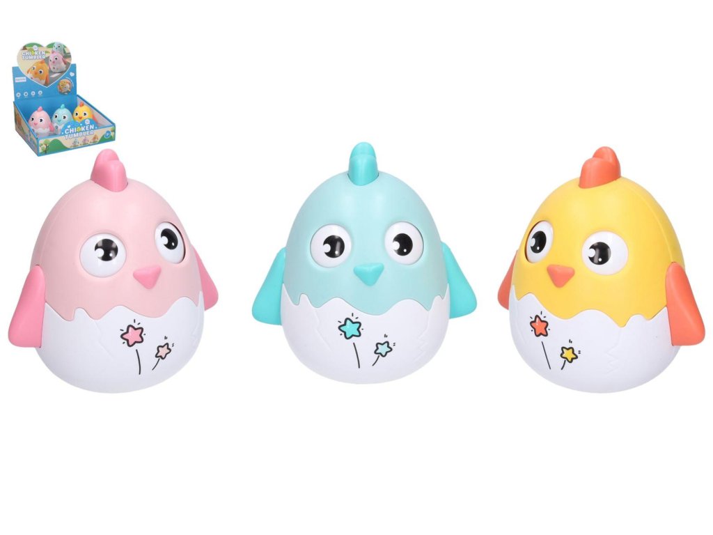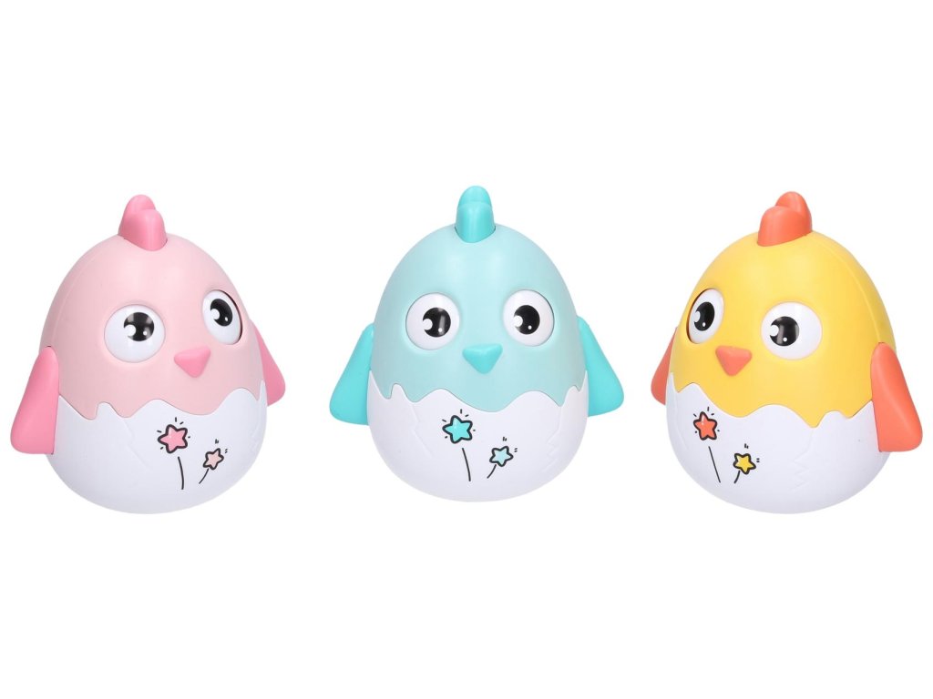 Roly poly kuře s rolničkami. Velikost 12x9x12 cm. Display box 9 ks. 3 varianty - žlutá, růžová, modrá.