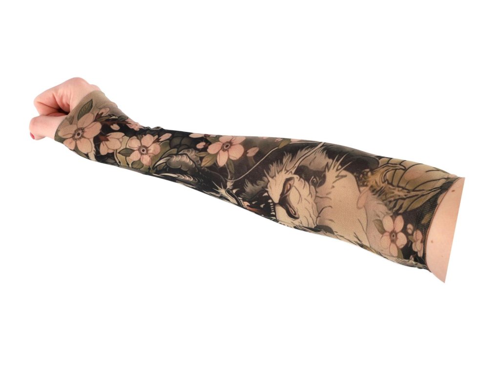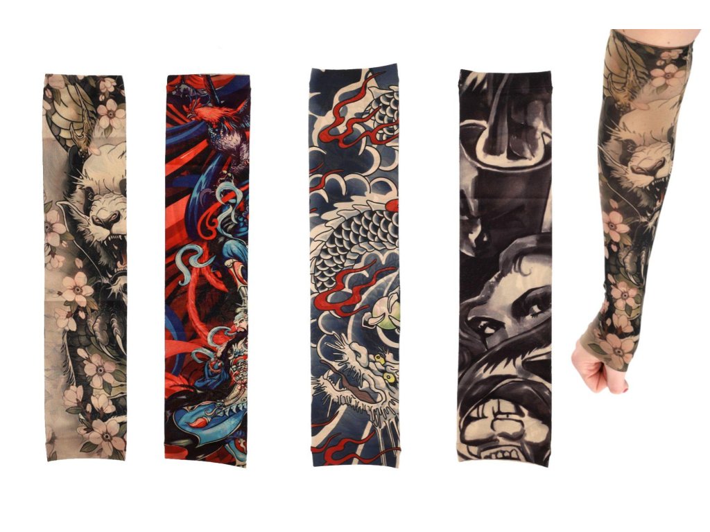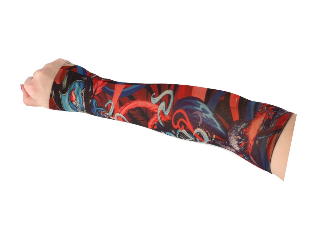 Tetovací rukáv z elastické látky je skvělým doplňkem pro každého, kdo chce vyzkoušet vzhled tetování bez trvalého závazku. Realistické motivy působí jako skutečné tetování a rukáv pohodlně zakryje celé předloktí.