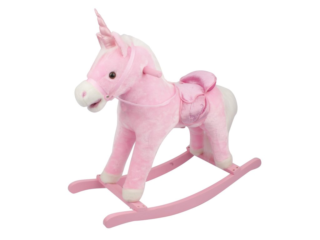 Růžový houpací jednorožec, který vydává zvuk při stlačení jednoho nebo druhého ouška. Jednorožec řehtá a kluše. Je vyroben z kvalitní a hebké plyše. Nosnost 30 kg.