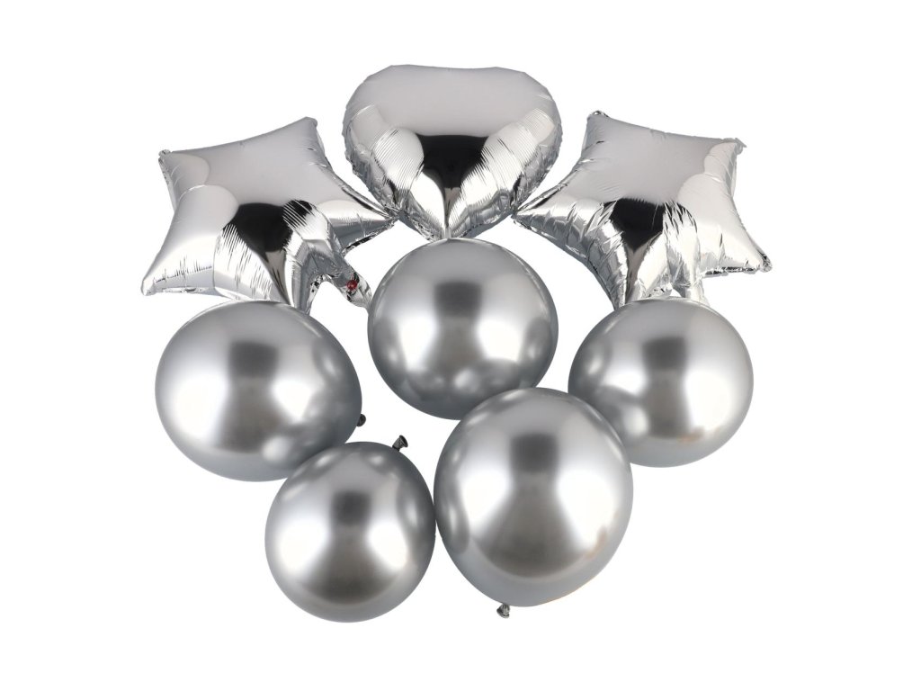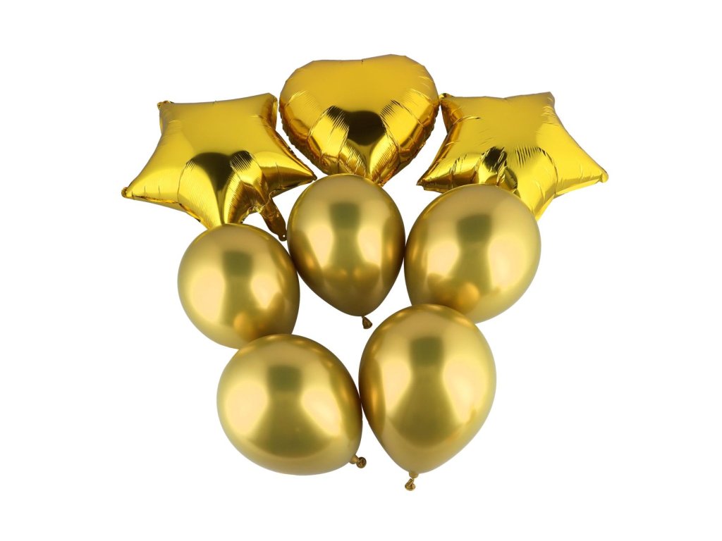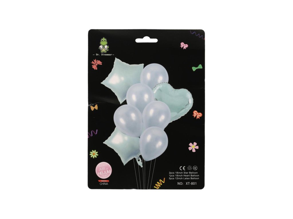 Obsahuje celkem 8 kusů – 1x fóliový balonek ve tvaru srdce, 2x fóliový hvězdicový balonek a 5x kulatých latexových balónků v ladících pastelových barvách.