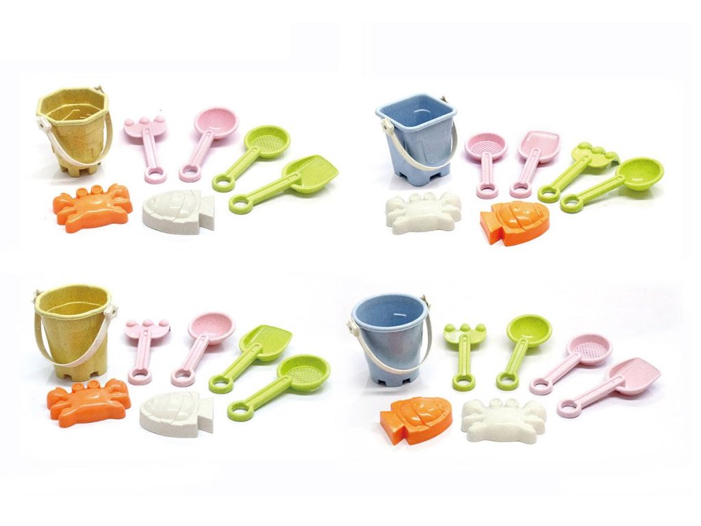 Sada na písek 7 ks. Součástí kbelík, 2 lopatky, sítko, hrabičky, 2 formičky.