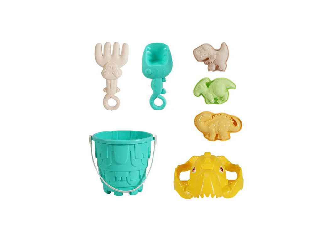 Sada na písek dino 7 ks. Obsah balení - kyblík 12x13,5 cm, víko se sítem 15,5x13 cm, 3 x formička dinosaura 7x8 cm, hrábě 18 cm, lopatka 18 cm.