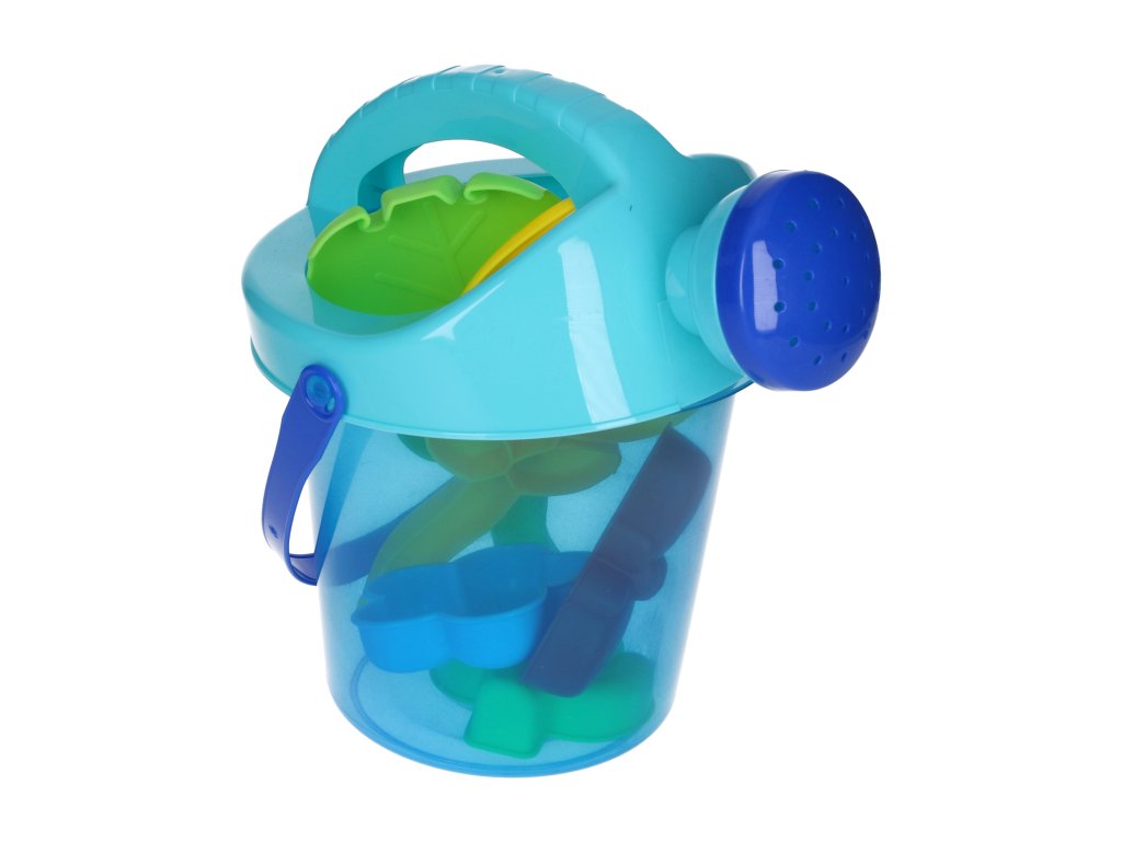 Sada na písek kyblík konvička 2v1. Rozměry kyblíku 15x15x15 cm. Obsah balení - kyblík, nástavec konvička, lopatka, hrábě, 3 formičky.