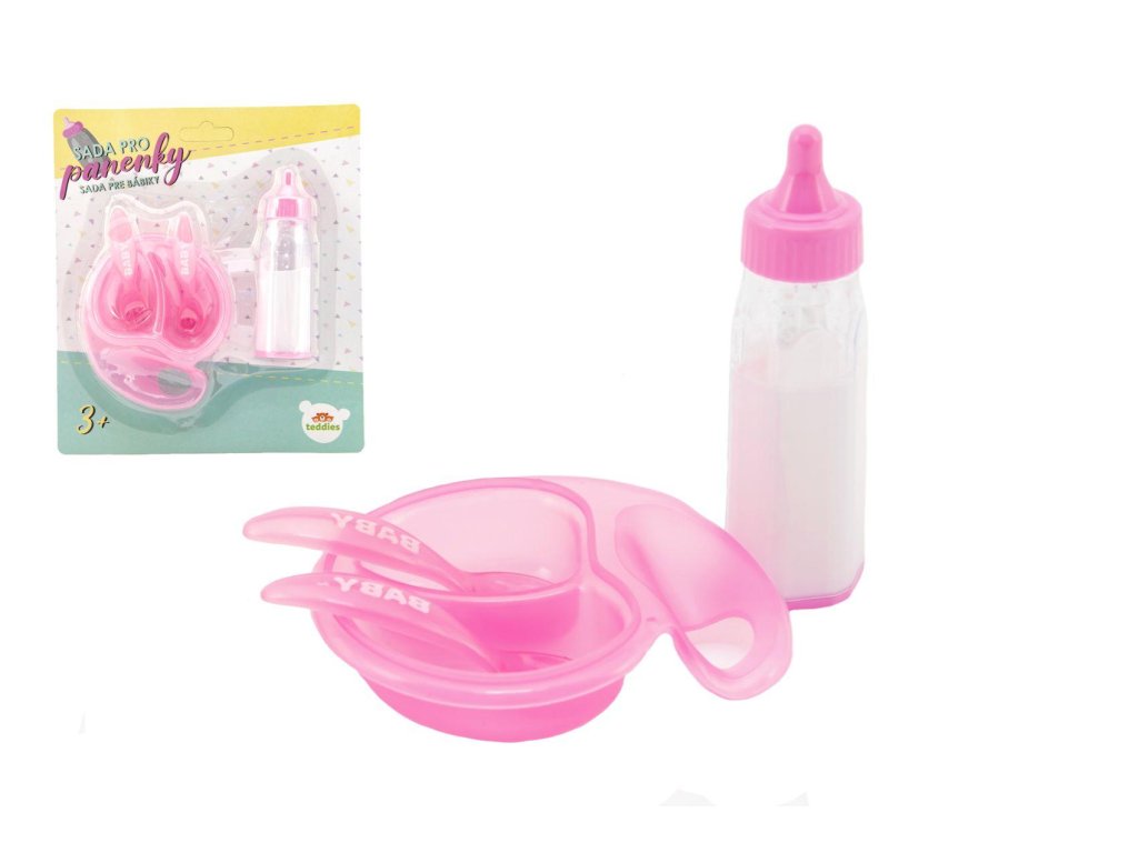 Sada pro panenky plast lahvička, miska s příborem na kartě 19x22x4cm