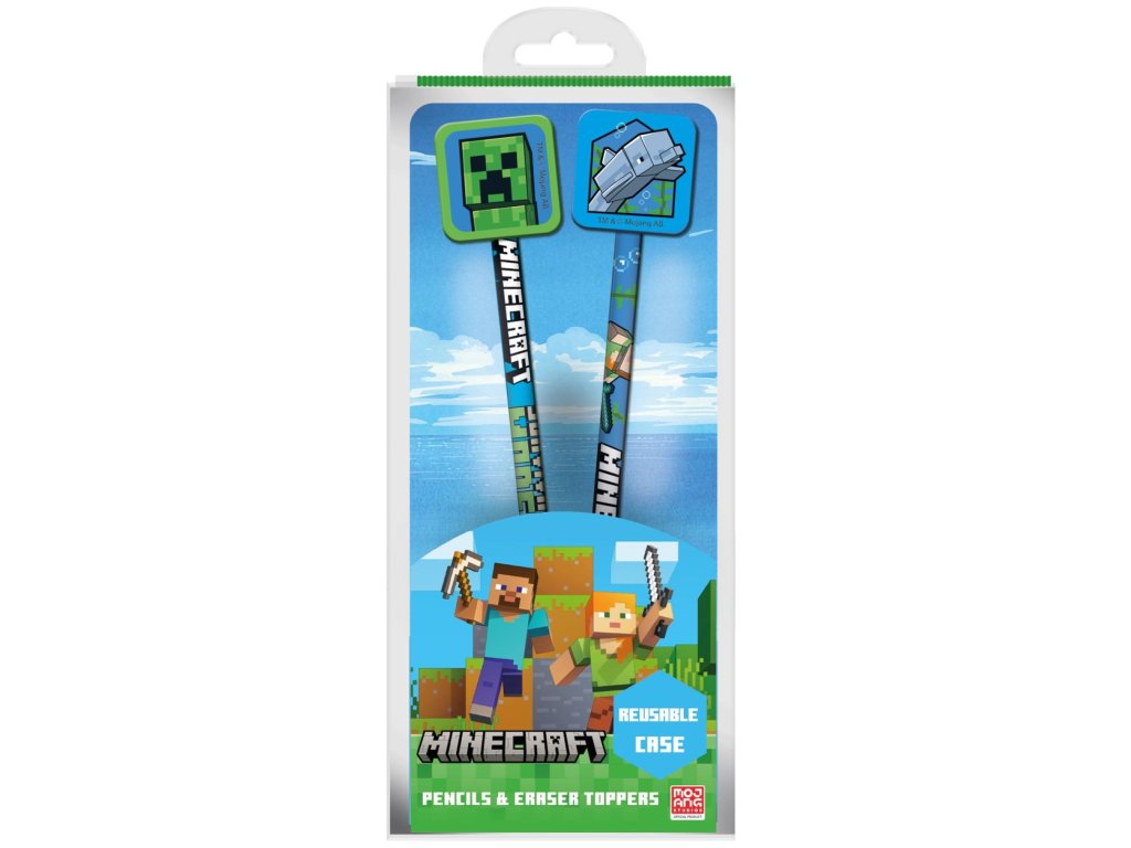 Set 2 ks tužek, součástí jsou nasazovací gumy s motivy Minecraft. Baleno v plastovém oablu pro opakované použití. Stylová sada 2 tužek s motivem Minecraftu, které zdobí originální toppery (nástavce) s oblíbenými motivy Creepera a delfína. Tužky jsou ideální pro školu i domácí tvoření a potěší každého fanouška této legendární hry.