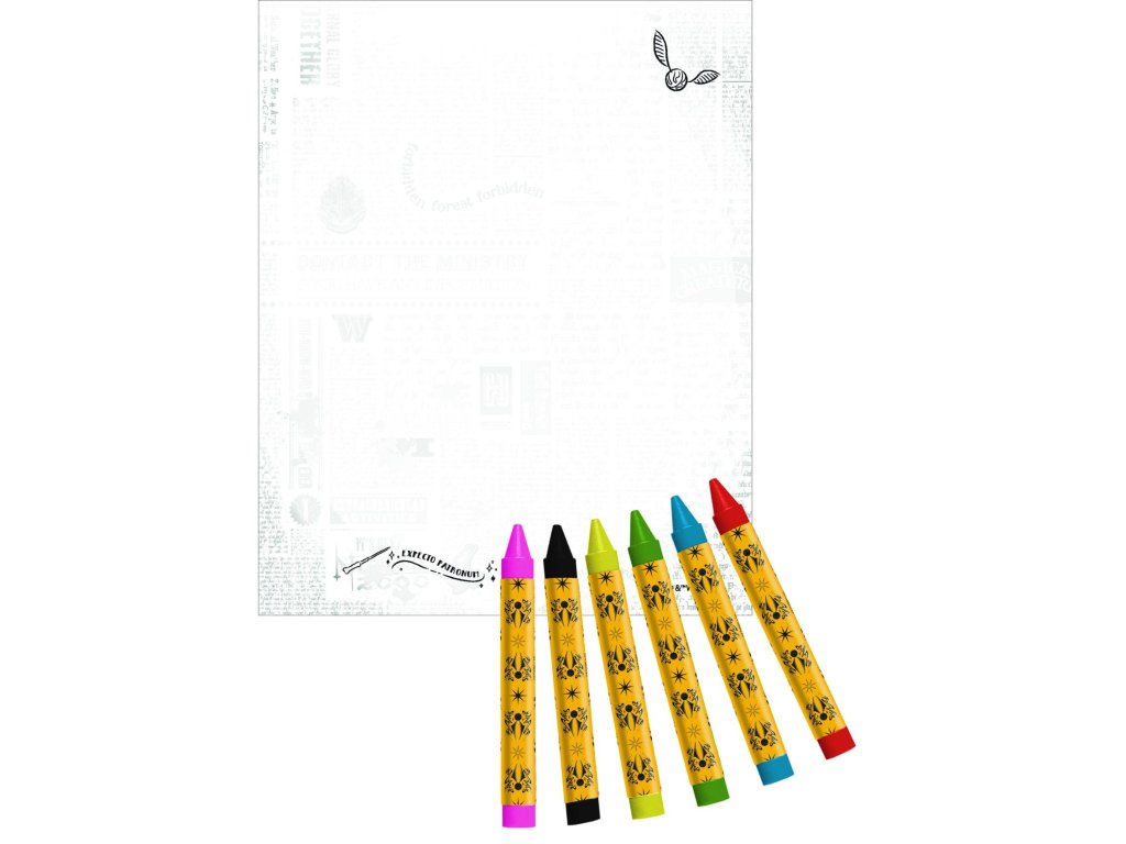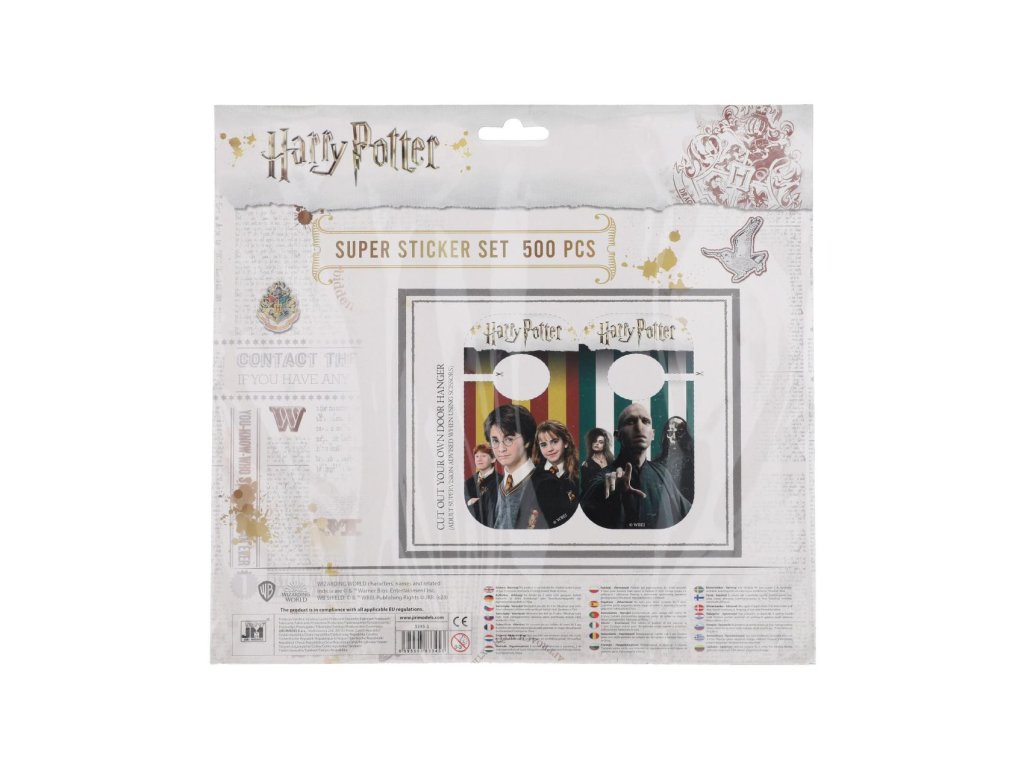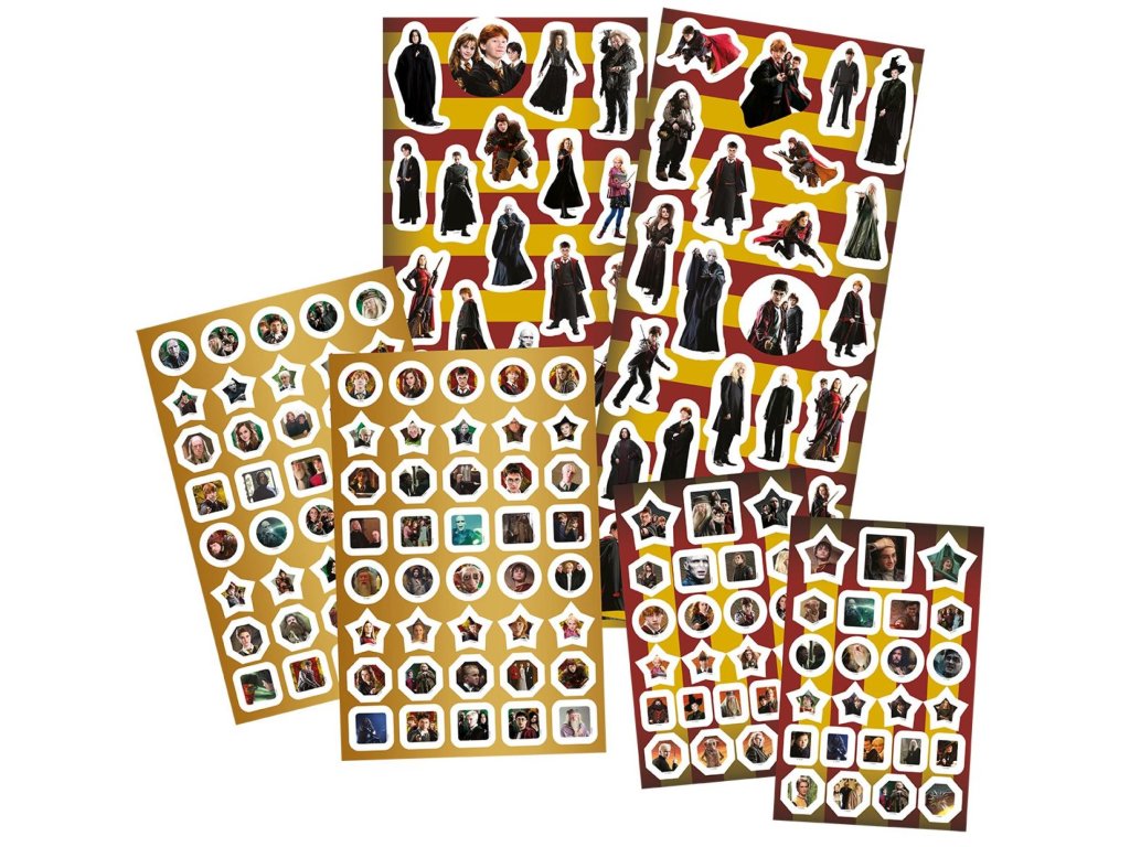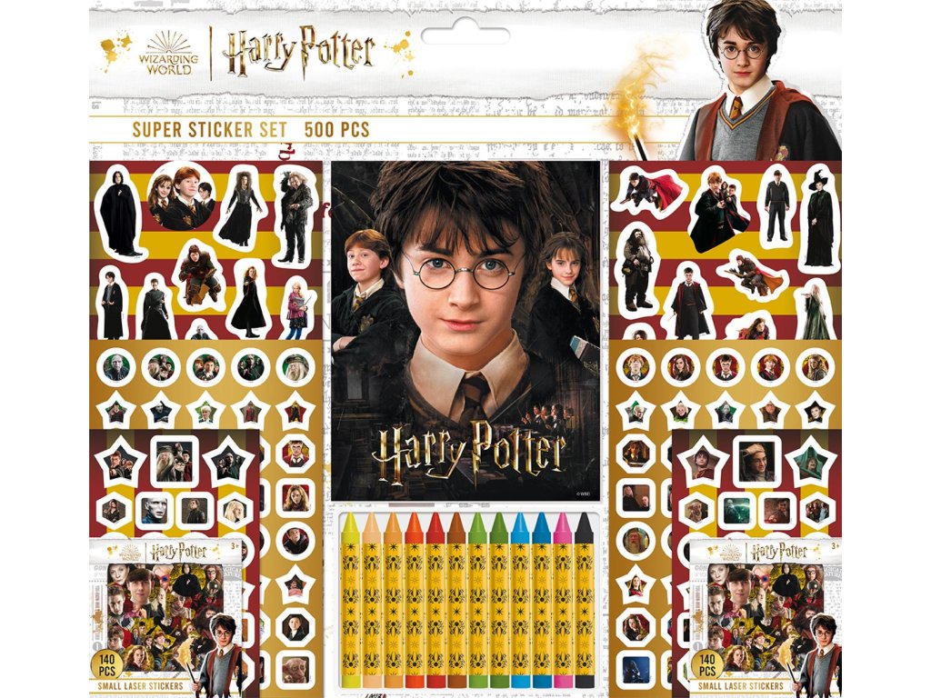 Set obsahuje téměř 500 různých druhů samolepek, blok (32 listů) ke psaní i malování a 12 voskovek. Tento velký samolepkový set obsahuje více než 500 samolepek s motivy oblíbených postav a scén z kouzelnického světa. Součástí balení je také blok s obálkou Harry Potter a sada 12 voskovek, se kterými si děti mohou vytvářet vlastní magické obrázky.