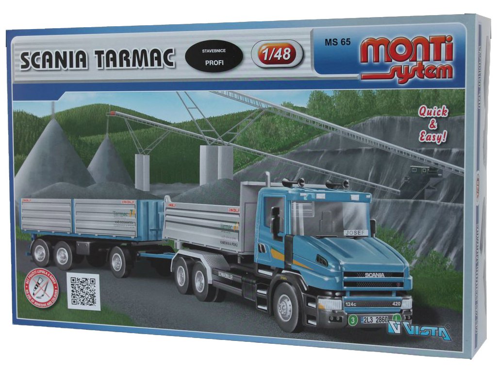 Model Scania MS 65 Tarmac s návěsem v měřítku 1:48. Obě korby jdou vyklápět, stejně tak i kapota motoru. Stavebnice patří do skupiny Profi.