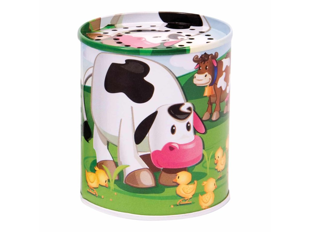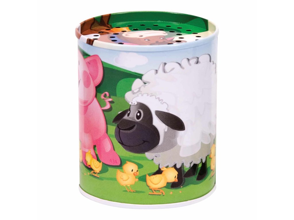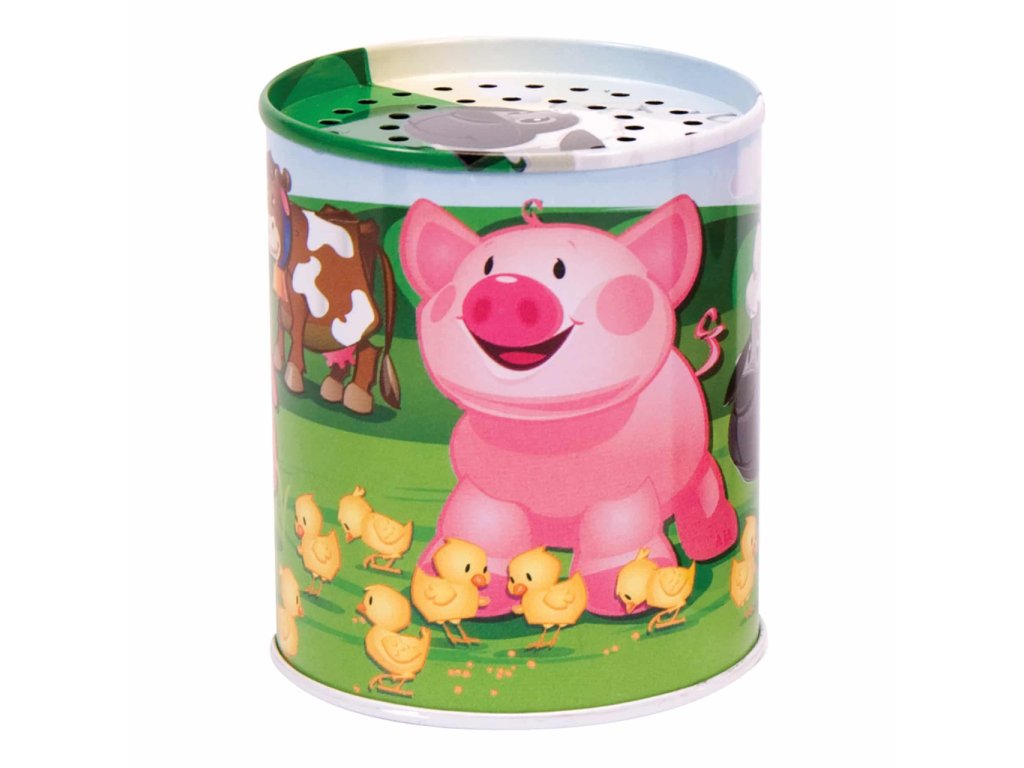 Naše plechovka se zvukem k Vám přináší farmu domů. Tato klasická plechová hračka je oblíbená po celá léta a pomáhá dětem rozvíjet rozpoznávání zvuků, když ji přiřazují ke správnému zvířeti. Kravičky, ovečky, kuřátka se pasou na polích, prasátka se vyhřívají v bahně a všichni jsou velcí kamarádi. Stačí jen plechovku otočit dnem vzhůru, a uslyšíte jejich zvuk. Designy a zvuky se mohou lišit. Otáčení plechovky také pomáhá rozvíjet koordinaci rukou a očí. Sledujte, jak se Vaše dítě těší z poslechu zábavných zvuků. Hlavní vlastnosti: podporuje představivostpomáhá rozpoznávat zvukypomáhá rozvíjet koordinaci rukou a očíplechová hračka v retro stylu