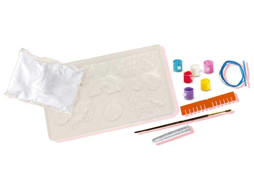 Obsah balení: sádra, forma, barvy 6ks, štětec, pomůcka na uhlazení sádry, stříbrné třpytky v tubě, modrá saténová stuha
