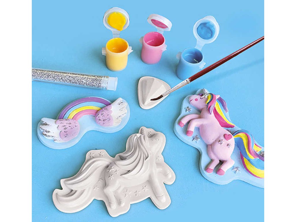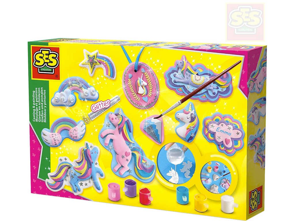 Máte také rádi jednorožce?Tato sada SES Creative vám umožní vytvořit si různé druhy figurek jednorožců vyrobených ze sádry. Nalijte sádru do formy a nechte ji zaschnout.Použijte přiložené barvy a vybarvěte si všechny jednorožce podle svých představ, nakonec posypejte třpytkami. Výsledek je fantastický!