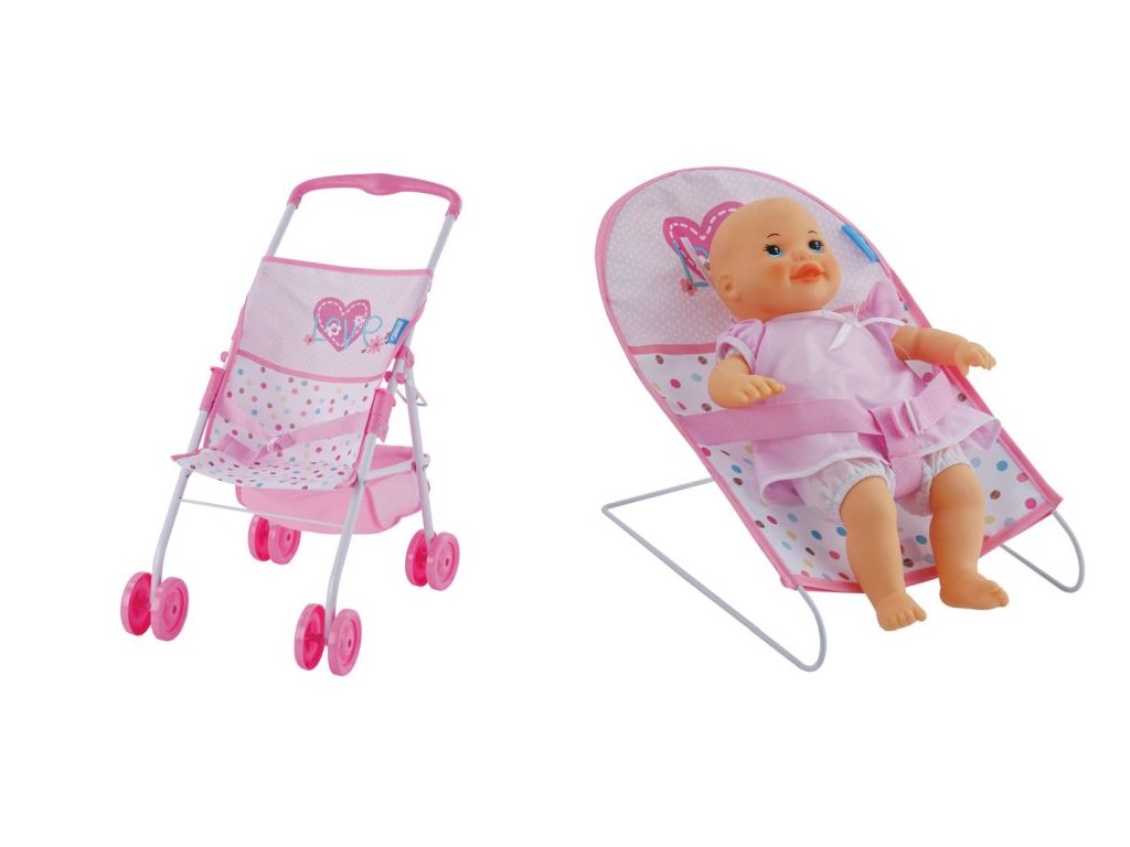 Nádherná sada 3v1 pro panenky do 45 cm obsahuje kočárek, panenku a houpátko.