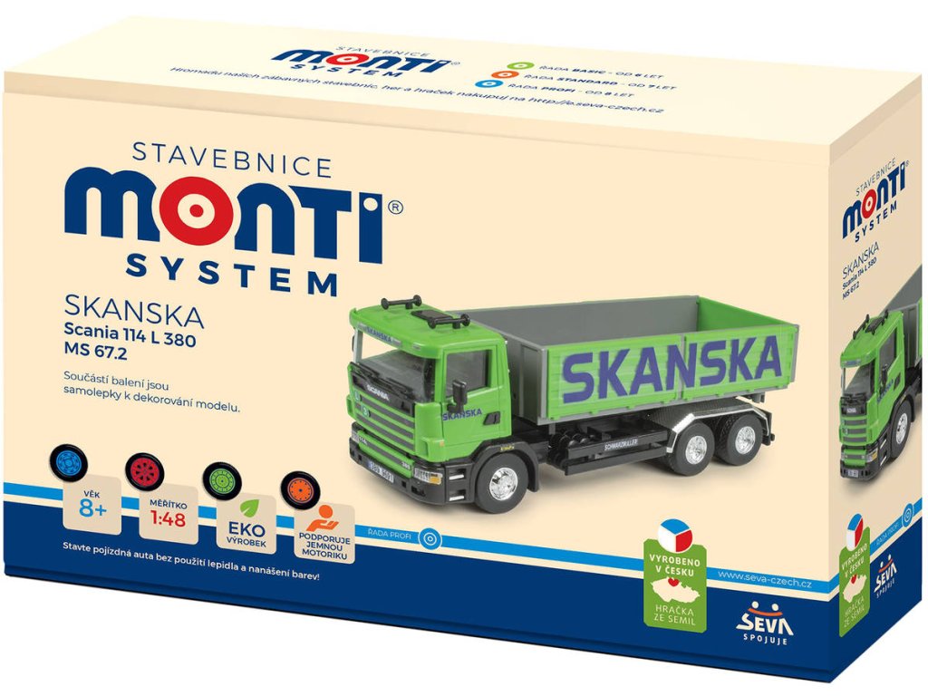 SEVA Monti System MS67.2 - Automobil Skanska Scania 114 L 380. Dětská plastová stavebnice. Sestavení modelu zacvakáváním do sebe (bez použití lepidla a barev).
