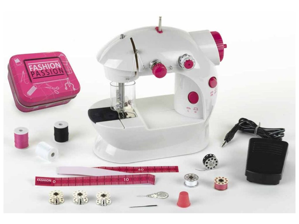 Funkční šicí stroj. Balení obsahuje: Šicí stroj, nožní pedál, 6 kovových cívek, náhradní jehlu, navlékač nití. Plastový kryt jehly, který chrání před poraněním.