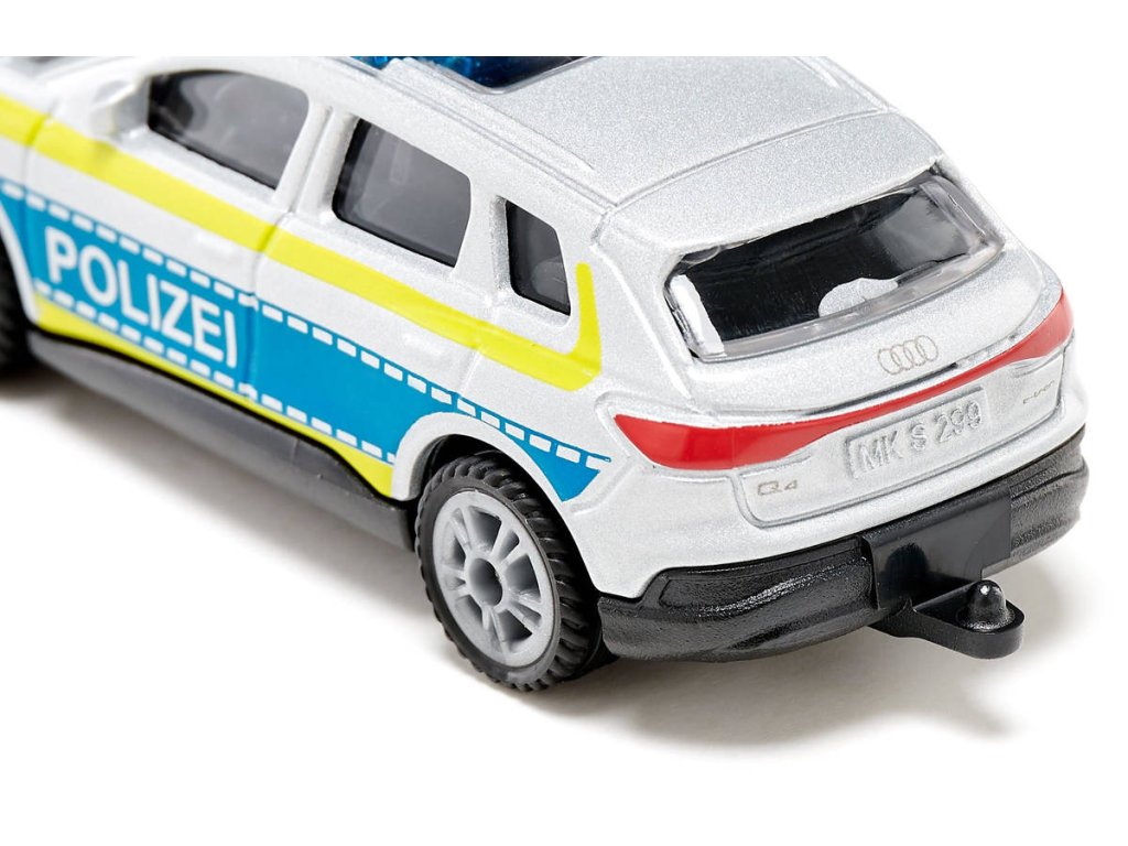 Bílý nápis na modrém pozadí v kombinaci s neonově žlutými pruhy POLIZEI – tento lak odlišuje současnou flotilu vozů Audi HP pro policii. S modelem Q4 e-tron automobilka představuje kompaktní, ale prostorné SUV s čistým designem a sportovním duchem – a poskytuje tak policii dokonalé vozidlo pro jejich každodenní mise na německých silnicích. Q4 vždy zaujme svým charakteristickým vzhledem – dokonce i člena malé flotily v dětském pokoji. Od kovové karoserie s čirým prosklením přes přední světlomety a zadní svítilny zdůrazněné vysoce kvalitním potiskem až po sportovní ráfky s pogumovaným běhounem. Model do nejmenšího detailu ladí s originálním vozem. Díky karoserii z odolného kovu a podvozku z robustního plastu vydrží toto Audi i při občasném nárazu při honičce. Vyrobeno z kovových a plastnových dílů.