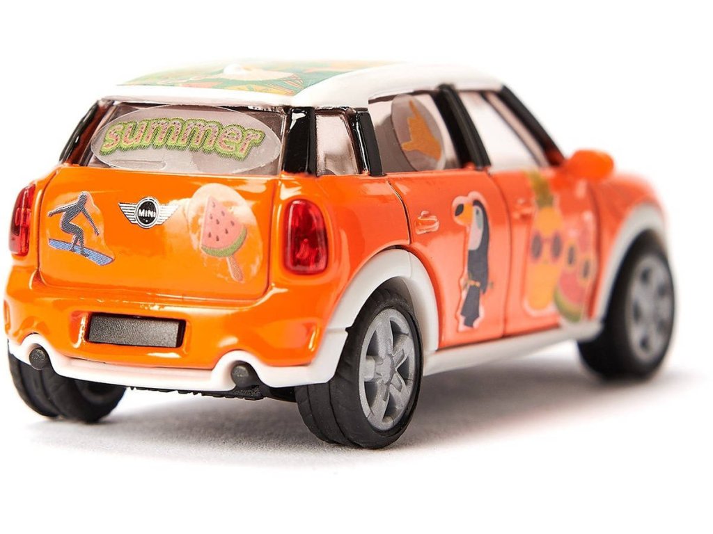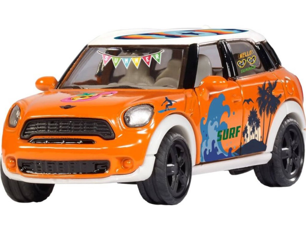 Léto, sluníčko, sluníčko! Pocit dovolené začíná, jakmile se Mini Countryman Summer rozjede! Není to jen kvůli jeho veselé oranžové karoserii, ale především kvůli dodávanému archu obsahujícímu mnoho pestrobarevných samolepek. S typickými letními motivy, jako jsou palmy, slunce, racci, surfaři a šplouchání vody, lze tento model během okamžiku proměnit v trendy prázdninový rychlík. Nejprve je však nutné jej sestavit, protože pro ještě větší zábavu je vůz dodáván z několika dílů s kovovou karoserií, sportovními ráfky a otevíracími dveřmi. Tyto části prostě potřebují přitlačit k sobě a pak je Mini Countryman Summer připraven k rychlému otočení na pláž!