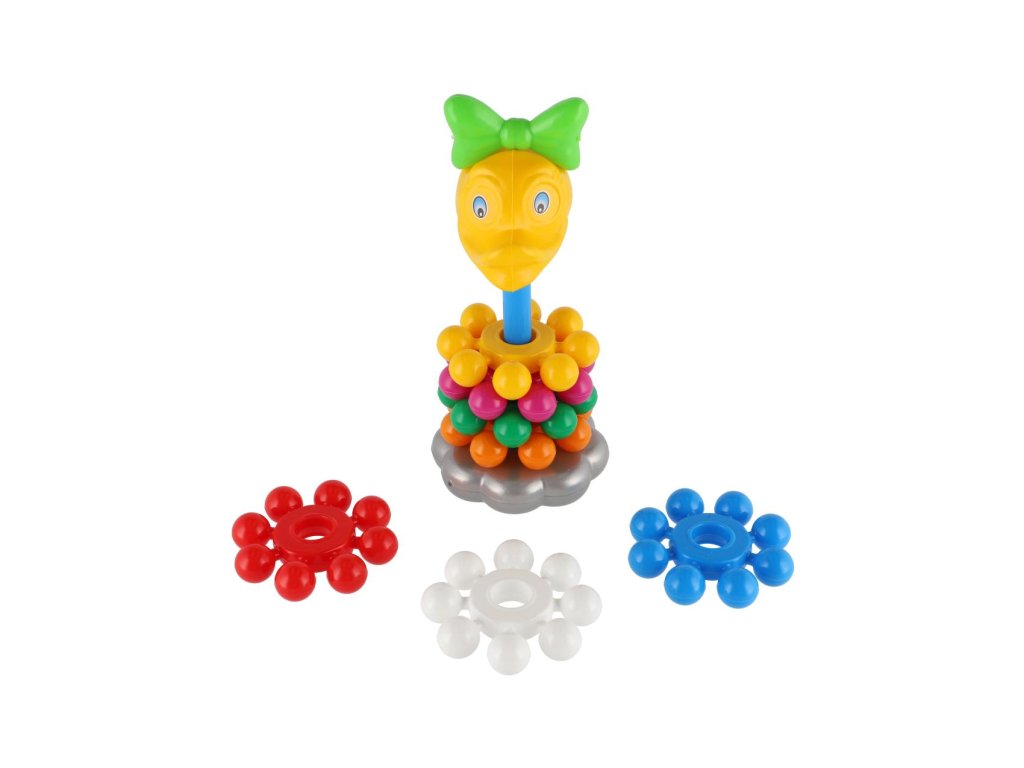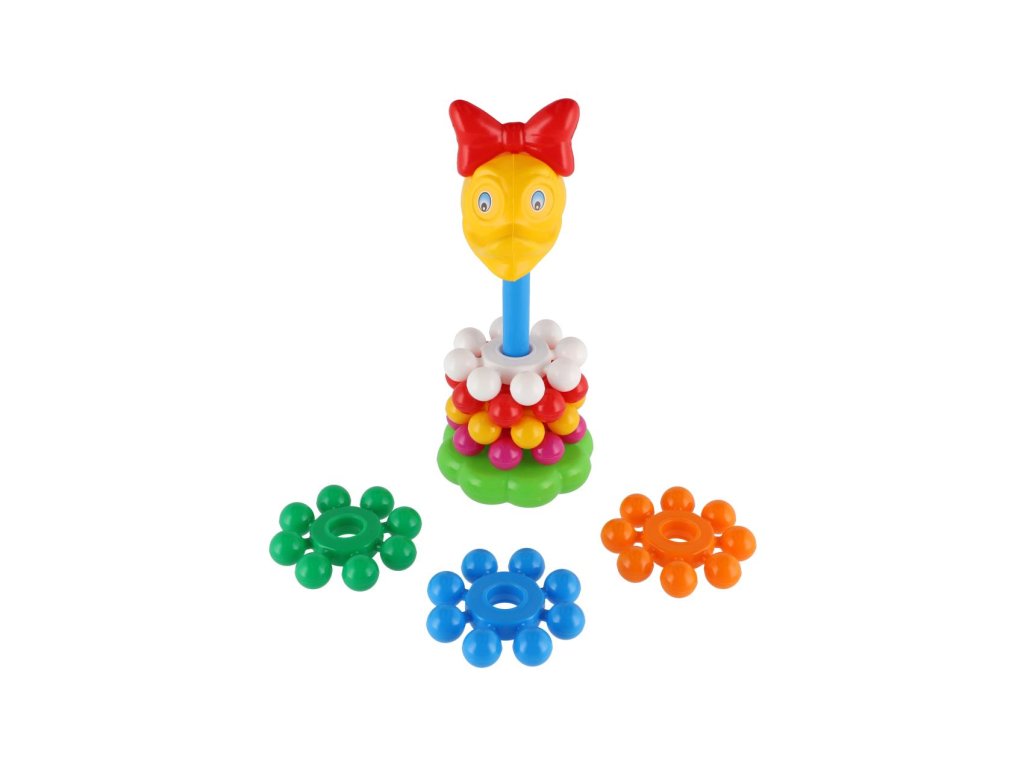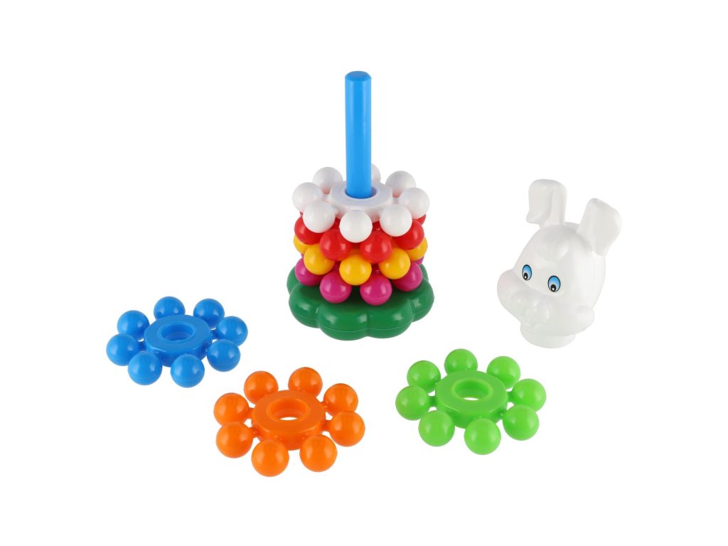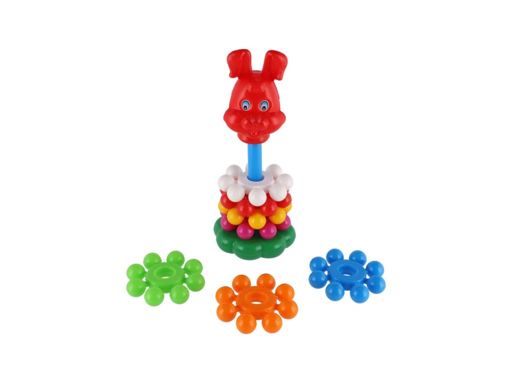 Skládanka s kroužky, ze které lze postavit pyramidu, si oblíbí každé dítě. Pyramida s barevnými kroužky pomáhá v rozvoji jemné motoriky a poznávání barviček. Velikost 26 cm. Vhodné od 12 měsíců.