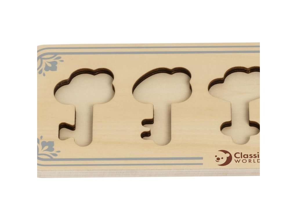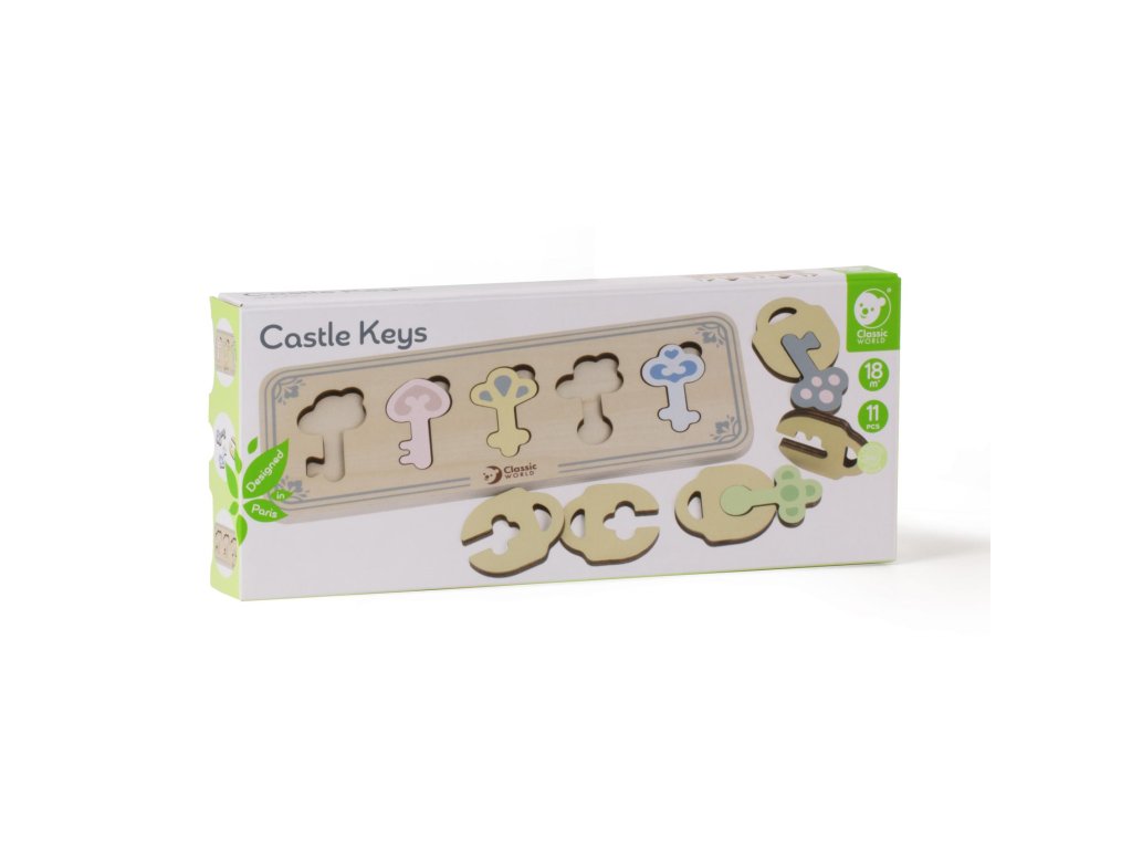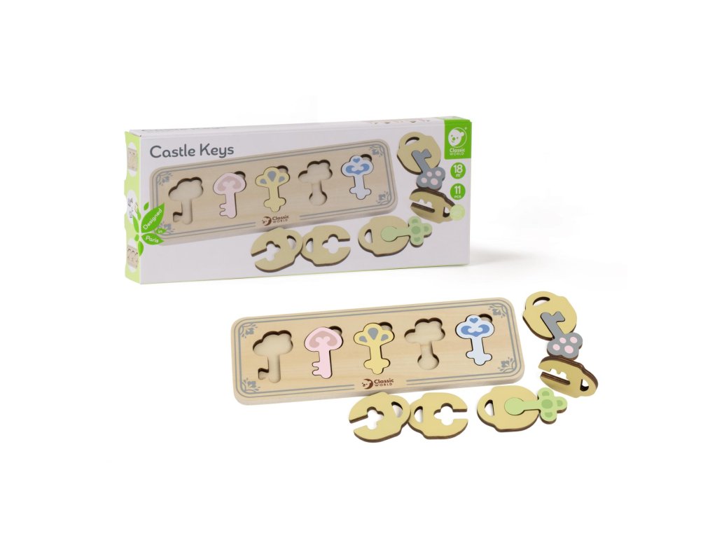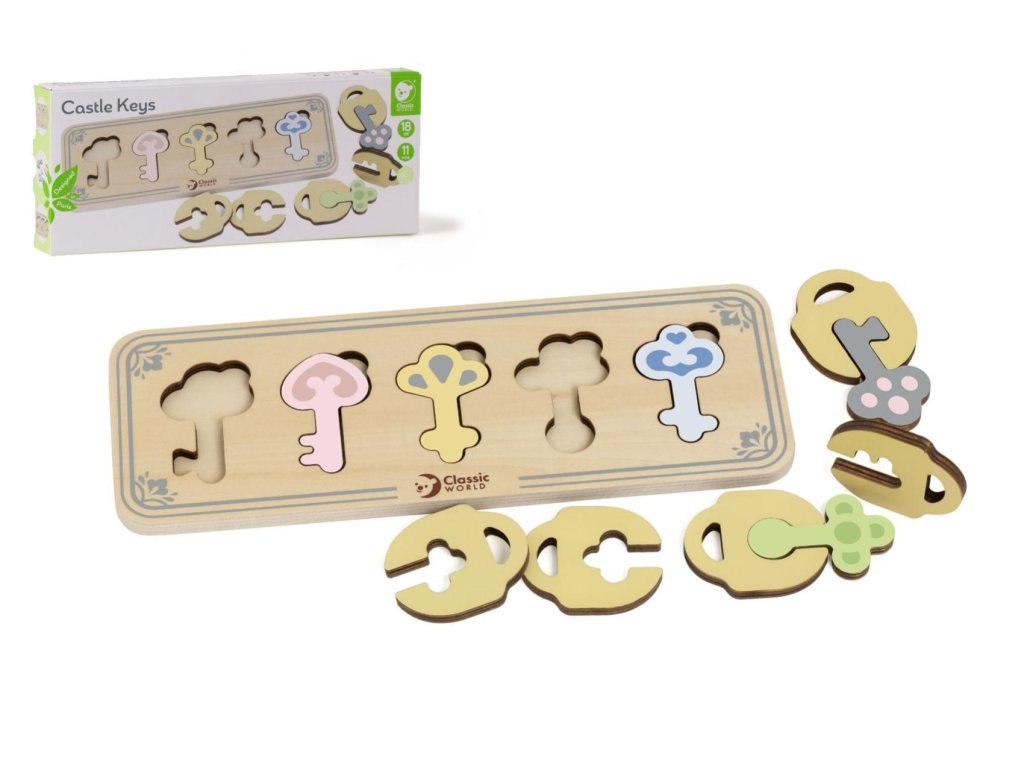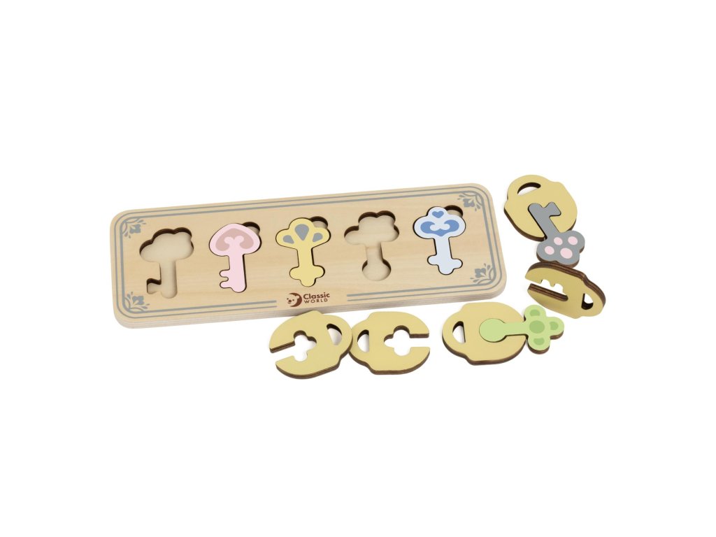 Dřevěné puzzle pro děti skládající se z dřevěného rámečku s výřezy ve tvaru klíčů, dřevěných klíčů a dřevěných zámků je vkládacím puzzle, které potrénuje motorické dovednosti, koordinaci očí a rukou, zrakové vnímání a potrápí dětskou mysl. Součastí balení je 11 kusů.¨