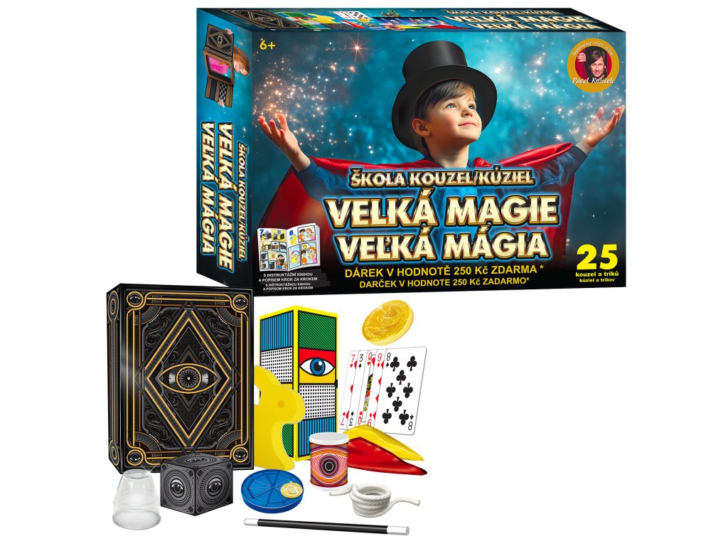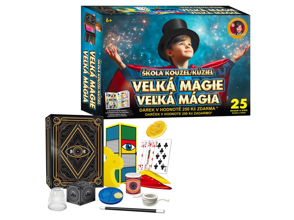 Objevte kouzelný svět iluzí s exkluzivní sadou Velká magie obsahující 25 velkolepých triků, díky kterým okouzlíte své přátele i rodinu! Tato sada je ideální pro všechny začínající i pokročilé kouzelníky, kteří chtějí předvést skutečně úžasná kouzla a vyvolat obdiv a úžas. Co vás čeká v sadě Velká magie: • 25 unikátních kouzel a triků v životní velikosti, které si zamilujete• Obří hrací karty, barevné šátky a tajemné rekvizity• Iluze velké kachny a králíka pro efektní vystoupení• Kolosální krabice na miznutí předmětů• Barevné šátky pro rafinované kouzelnické efekty Hlavní přednosti: • Velkolepý úspěch a aplaus: Díky obřím trikům a iluzím zapůsobíte na každé publikum• Instruktážní kniha i video: Krok za krokem se naučíte, jak jednotlivá kouzla správně předvést• Možnost použití běžných předmětů: Některé pomůcky nejsou součástí balení, lze ale využít věcí z domácnosti• Bezpečnost na prvním místě: Sada není vhodná pro děti mladší 8 let, obsahuje malé části – dohled dospělých je doporučen Doporučení a bezpečnostní upozornění: • Odstraňte obal před použitím, igelitový obal může být nebezpečný pro děti• Sada obsahuje malé části, které mohou představovat nebezpečí spolknutí nebo vdechnutí• Nenechávejte ani nepoužívejte v blízkosti ohně nebo jiných zdrojů vysoké teploty• Některé pomůcky ke kouzlení nejsou součástí balení• Doporučujeme přítomnost dospělé osoby při hraní a předvádění triků • Doporučený věk: 8+ Pro koho je sada určena? • Pro všechny, kteří chtějí okouzlit své publikum• Pro začínající i zkušené kouzelníky• Pro děti a dospělé, kteří hledají hodiny zábavy a učení• Ideální jako dárek na narozeniny, Vánoce nebo jiné slavnosti Se sadou Školy kouzel – Velká magie 25 triků budete mít v rukou kouzla, která zaručeně očarují každého! Naučte se mystické triky, ovládněte umění iluze a staňte se hvězdou každé show. Objednejte si tuto magickou sadu hned teď a připravte se na nepřekonatelné kouzelnické zážitky!