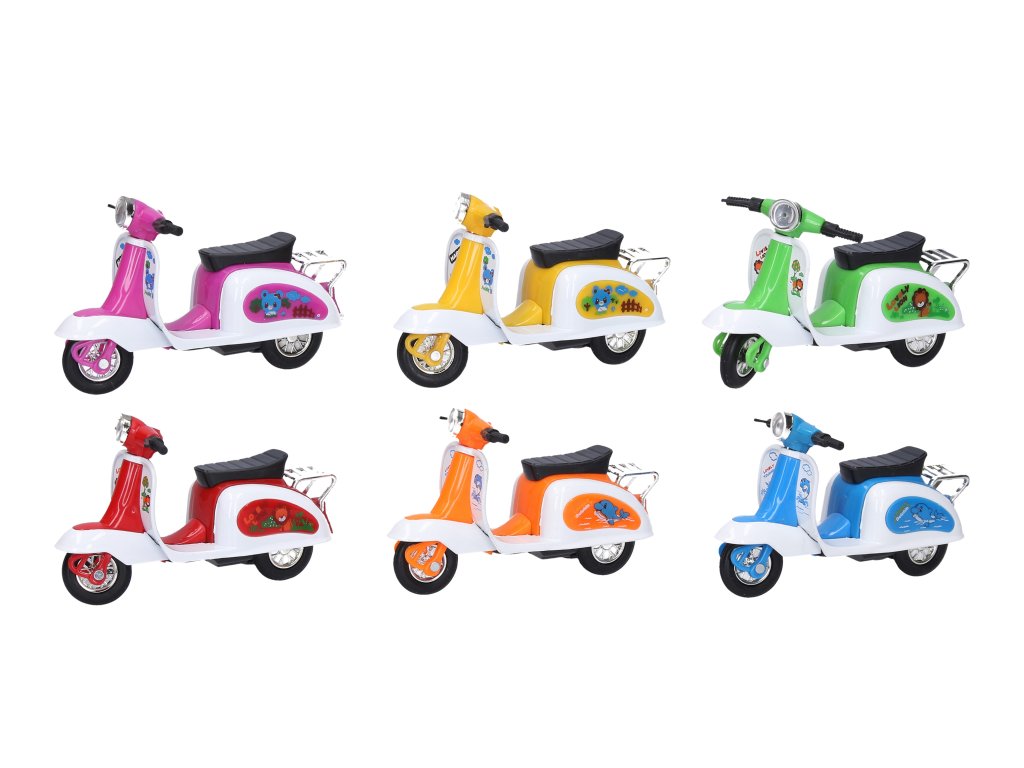 Skútr volná kola 12 cm. Rozměry 12x5x7 cm. Display box 6 ks. 6 variant - modrá, zelená, žlutá, červená, oranžová, růžová.