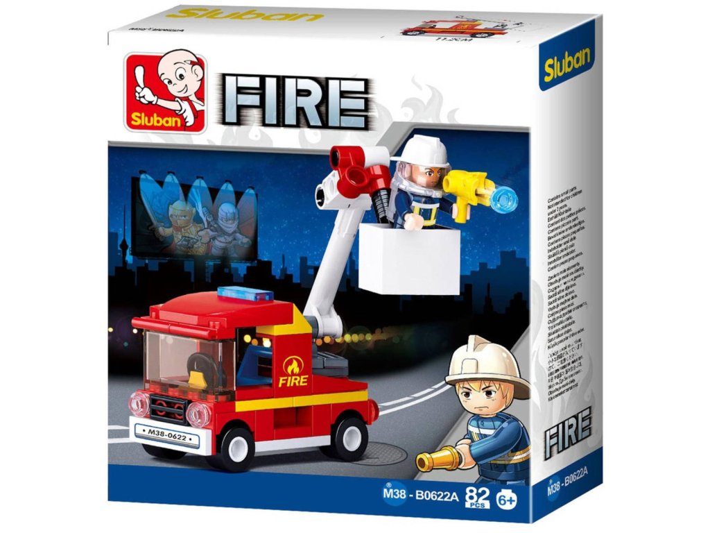 SLUBAN Fire (M38-B0622A) Hasičský vůz s malou plošinou. Kvalitní plastová stavebnice. Lze kombinovat s většinou ostatních známých stavebnic. Součástí 1 figurka.