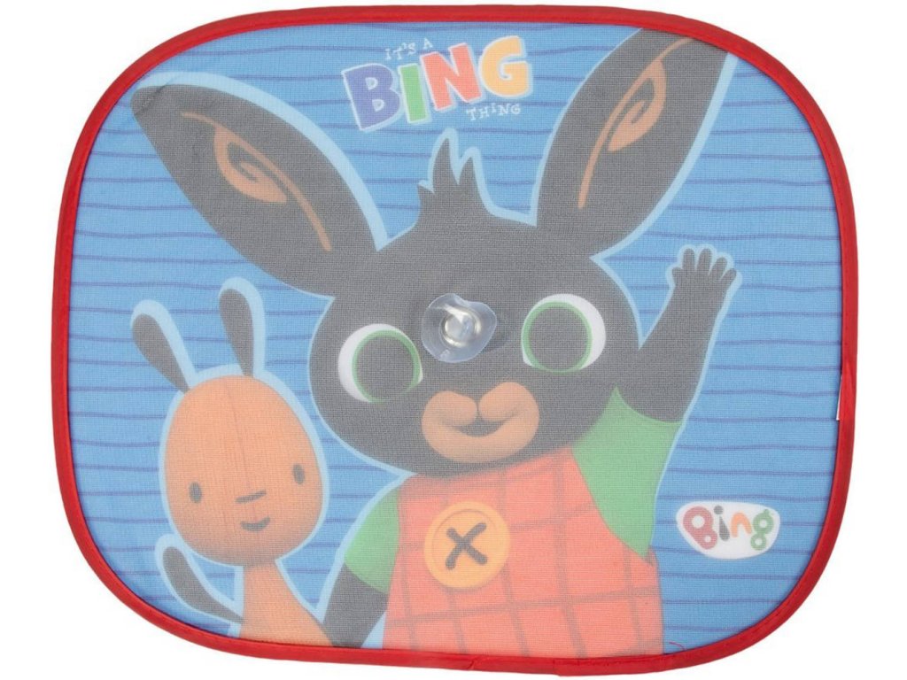 Dětská ochranná sluneční clona na boční nebo zadní sklo do auta, motiv králíček Bing. Brání pronikání slunečních paprsků do vozidla. Upevnění na přísavku. Součástí 2 clony.
