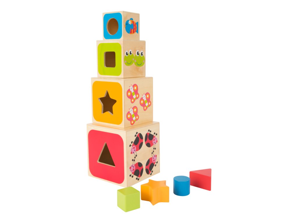 Dřevěné vkládací kostky učí děti geometrickým tvarům, barvám, číslům i písmenům. Geometrické tvary musí být vloženy přes správné otvory. Vytištěná písmena na kostkách musí být naskládána ve správném pořadí, což nabízí optimální výukový nástroj. Upevňuje jemnou motoriku dítěte. Roztomilé motivy zvířátek děti zaujmou a učení pro ně bude velkou zábavou. Hlavní vlastnosti: obsahuje 4 vkládací kostkyučí děti geometrickým tvarům, barvám, číslům a písmenůmprocvičuje jemnou motoriku dětí