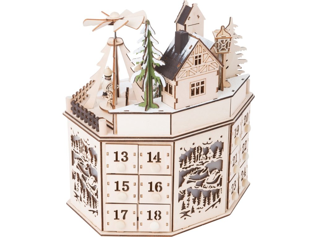 Kouzelná vánoční krajinka. Tento detailní adventní kalendář nadchne krásným designem nasvícených historických budov ve vánočním městečku. Po stranách jsou nejen očíslované šuplíčky, ale také vyřezávané obrázky, které jsou také nasvíceny. Baterie nejsou součástí balení. Hlavní vlastnosti: adventní kalendář, který upoutá pozornost každého... vytváří kouzelnou adventní atmosféruodpovídá evropské bezbečnostní normědrobné,jemně vyřezávané detaily