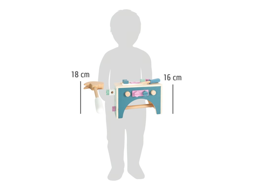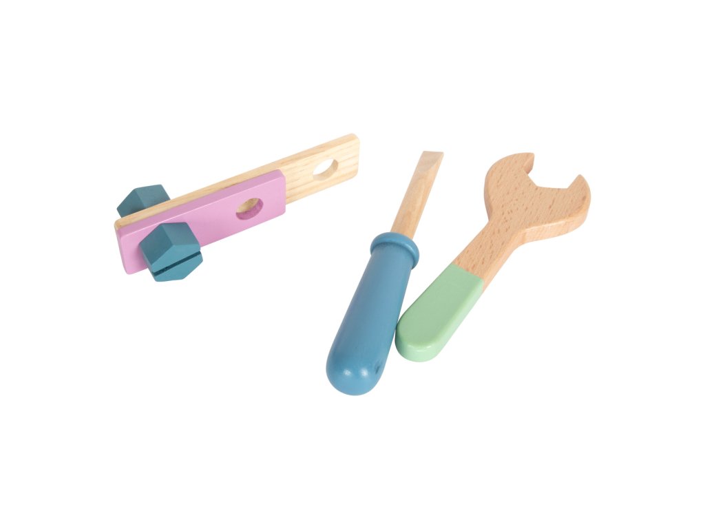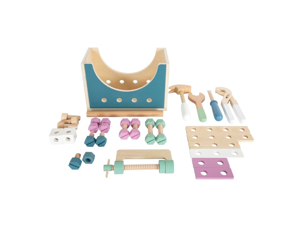 Praktická sada nářadí v bedýnce s rukojetí. Hračka 2v1, když bedýnku otočíte, můžete ji použít jako pracovní desku! Díky této vychytávce dětem hračka nabídne nekonečné možnosti hraní, mohou si hrát i na cestách. Neokázalé skandinávské barevné schéma s jasně viditelným dřevem. V balení najdete 5 ks nářadí – kladivo, klíč, šroubovák, hasák, svěrák. Rukojeť můžete odstranit za pomocí nářadí, nářadí můžete do bedýnky jednoduše uložit díky jejím otvorům. Genderově neutrální design v jemných pastelových barvách. Skvěle se hodí k ostatním produktům z řady Nordic. Hlavní vlastnosti: dřevěná motorická hračkagenderově neutrální designproduktová řada Nordic