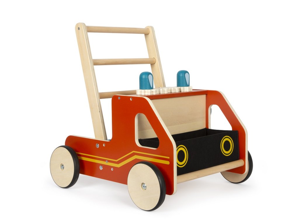 Robustní dřevěné dětské chodítko ve stylovém hasičském designu uchvátí každé dítě. Toto dětské hasičské chodítko je doplněno ozubenými koly, pohyblivými modrými světly a také otočným kolečkem s klikou na boku chodítka. Tyto přídavné prvky rozvíjejí motorické dovednosti dětí a činí chodítko ještě zábavnější při jejich prvních krůčcích. Chodítko je vybavené pogumovanými koly, která jsou velmi tichá. Díky brzdovému systému je chodítko bezpečné i při rychlejší jízdě. Toto hasičské chodítko děti nejen zabaví, ale i rozvíjí koordinaci ruka-oko. Hlavní vlastnosti: robustní dřevěná konstrukce s brzdovým systémemvyjímatelný úložný prostor ve formě plstěného košepogumovaná kola pro tichou a bezpečnou jízdudoplněno herními prvky (ozubená kola, otočné kolo s klikou, pohyblivá světla)rozvíjí motorické dovednosti