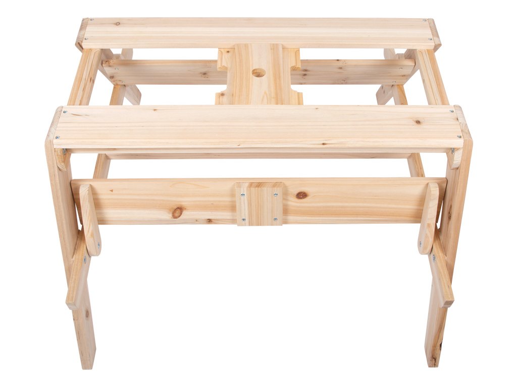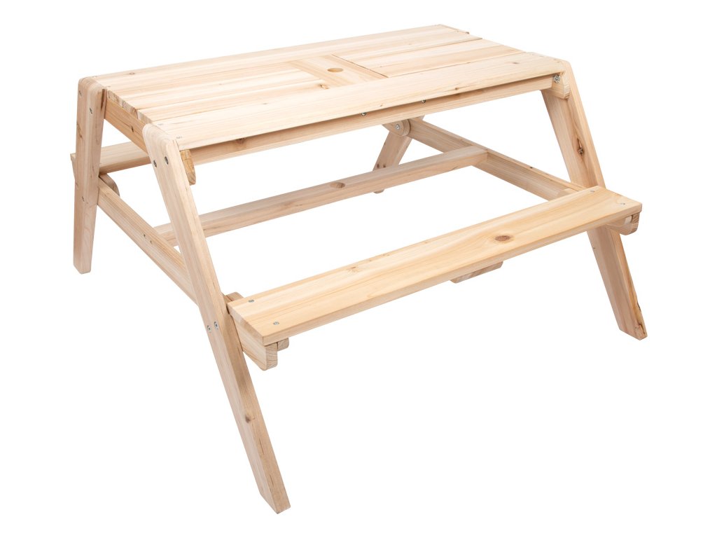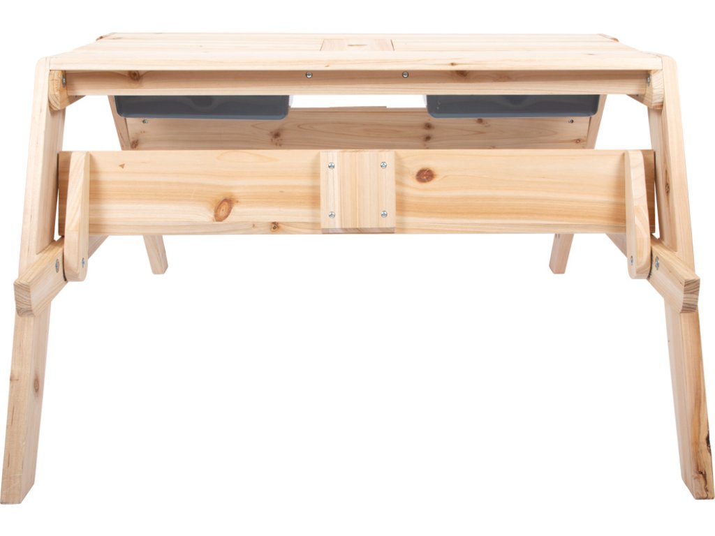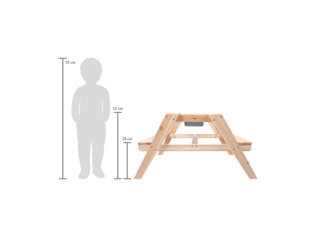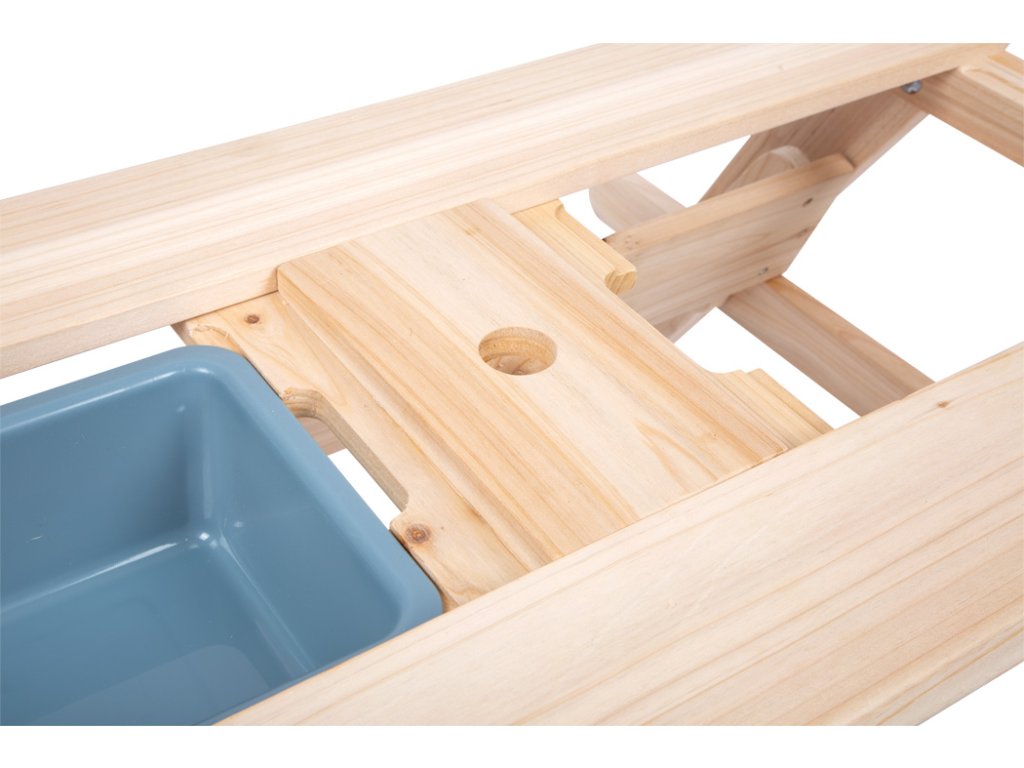 Baví Vás vyrábět bahno a jiné směsi z přírodních materiálů? Tento stůl z masivního dřeva odolného vůči povětrnostním vlivům upoutá nejen pozornost na zahradě, terase nebo balkonu, ale především nabízí dětem možnost dlouhé hodiny kreativní hry na čerstvém vzduchu. Vrchol se skrývá uvnitř dětského stolku. Jakmile se zvednou dvě stolní desky, vznikne úžasné místo na hraní s pískem, vodou nebo blátem. Dvě odnímatelné vaničky z robustního plastu o objemu 3 litry každá, jsou ideální nejen na míchání různých materiálu, ale také pro uskladnění hraček na písek, uskladnění písku, sběr přírodních materiálů nebo naplnění vodou. Lavice se dají sklopit. Chytrá, multifunkční dětská sedací souprava, která kromě funkce posezení může sloužit také jako piknikový stůl, stůl k malování atd. Prohlubně v oblasti plastových van usnadňují vyjímání van a do otvoru uprostřed plochy stolu se dá zasunout slunečník pro stínění. Rozšířené nohy zajišťují bezpečné postavení, stabilitu a vysoce kvalitní dřevo zaručuje dlouhou životnost. To je důležité, protože stůl povzbuzuje děti, aby přicházely s novými, kreativními nápady na hraní a experimentovaly po dlouhou dobu. Co plave na hladině vody, co se potápí? Co se stane s pískem když zmokne? Jaké tvary můžete vytvořit s hračkami do písku? Hra s pískem nabízí řadu smyslových podnětů prostřednictvím povrchového vnímání kůže a podporuje jemnou motoriku. Pro dlouhodobé používání a pro ochranu neošetřovaného dřeva je možné jej ošetřit ochrannou lazurou na dřevo a barevně upravit dle vlastních potřeb. Hlavní vlastnosti: multifunkční posezení 2 v 1 vyrobeno z masivního dřeva2 vyjímatelné multifunkční plastové vaničky (3l)kompaktní posezení na terasy, balkony a zahradynosnost 100 kg