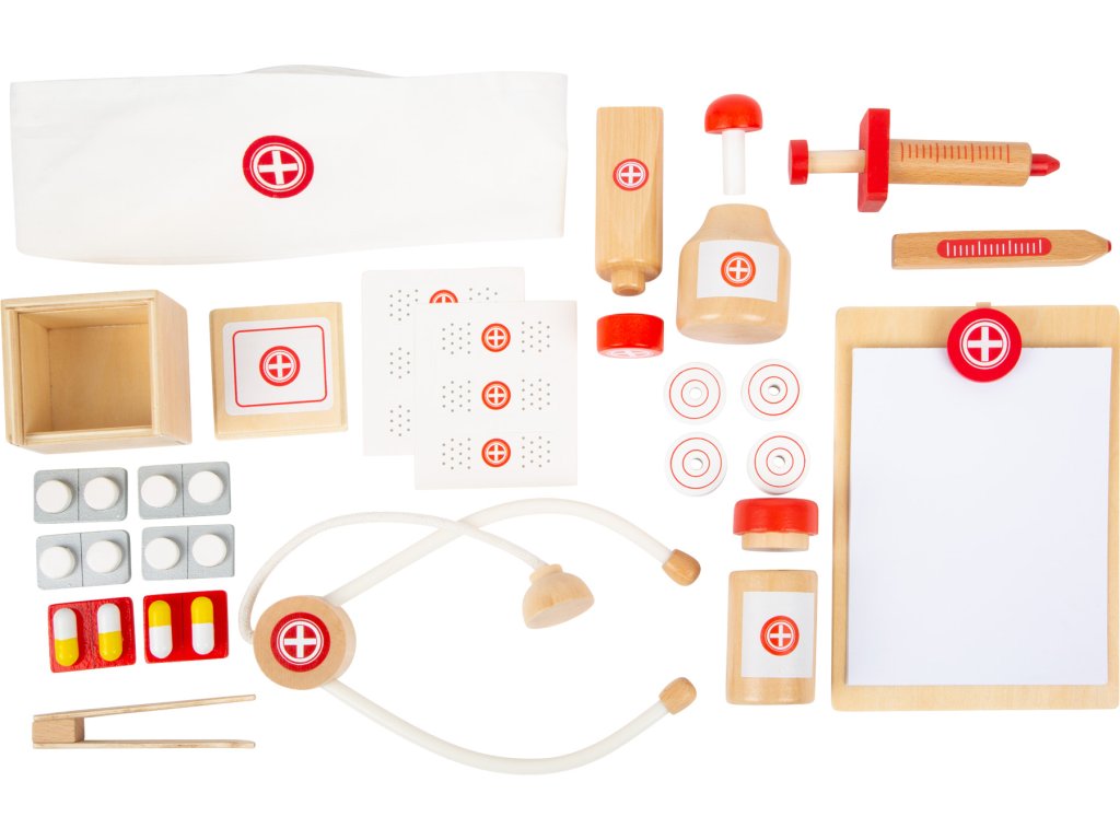 Lékaři už jsou na cestě! Mladí doktoři a doktorky se mohou s tímto dětským setem perfektně vybavit na cestu k pacientům. Kufřík obsahuje všechny důležité zdravotnické pomůcky, také vypadá pěkně – je plně dřevěný s klasickou bílo-červenou barvou. V kufříku najdete balení mastičky, láhev s tinkturou, stetoskop, injekční stříkačku, náplasti, tabletky, pinzetu, teploměr, papírový blok. Vše je samozřejmě určeno pouze pro hru a je dřevěné nebo papírové. Kufřík první pomoci pro plyšáky nebo panenky. Děti si mohou zahrát na lékaře, tato hra podporuje kreativitu a dodá dětem odvahu. Všechny doplňky se pohodlně vejdou do kufříku. Otevřete si vlastní praxi! Hlavní vlastnosti Dřevěný kufřík na zámkyLahvičky léků, stetoskop, injekční stříkačka, teploměr, pinzetaV klasické červeno-bílé barvě