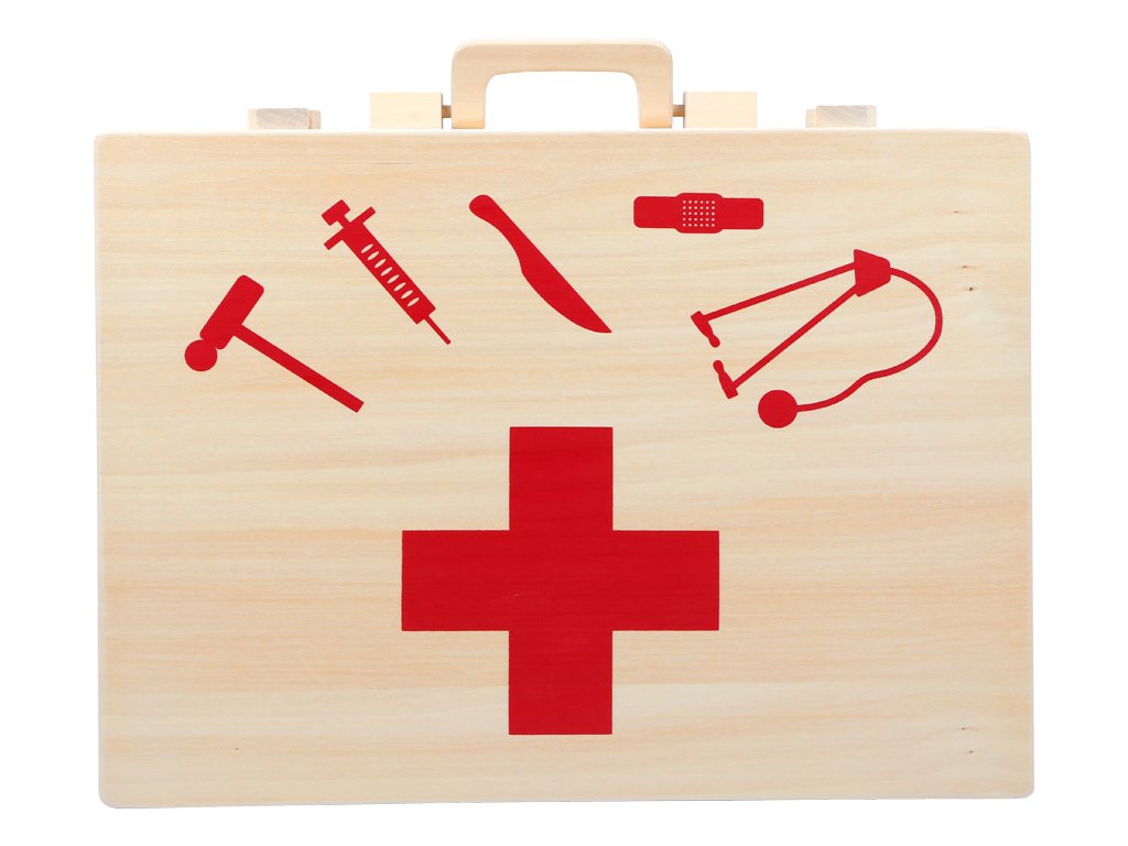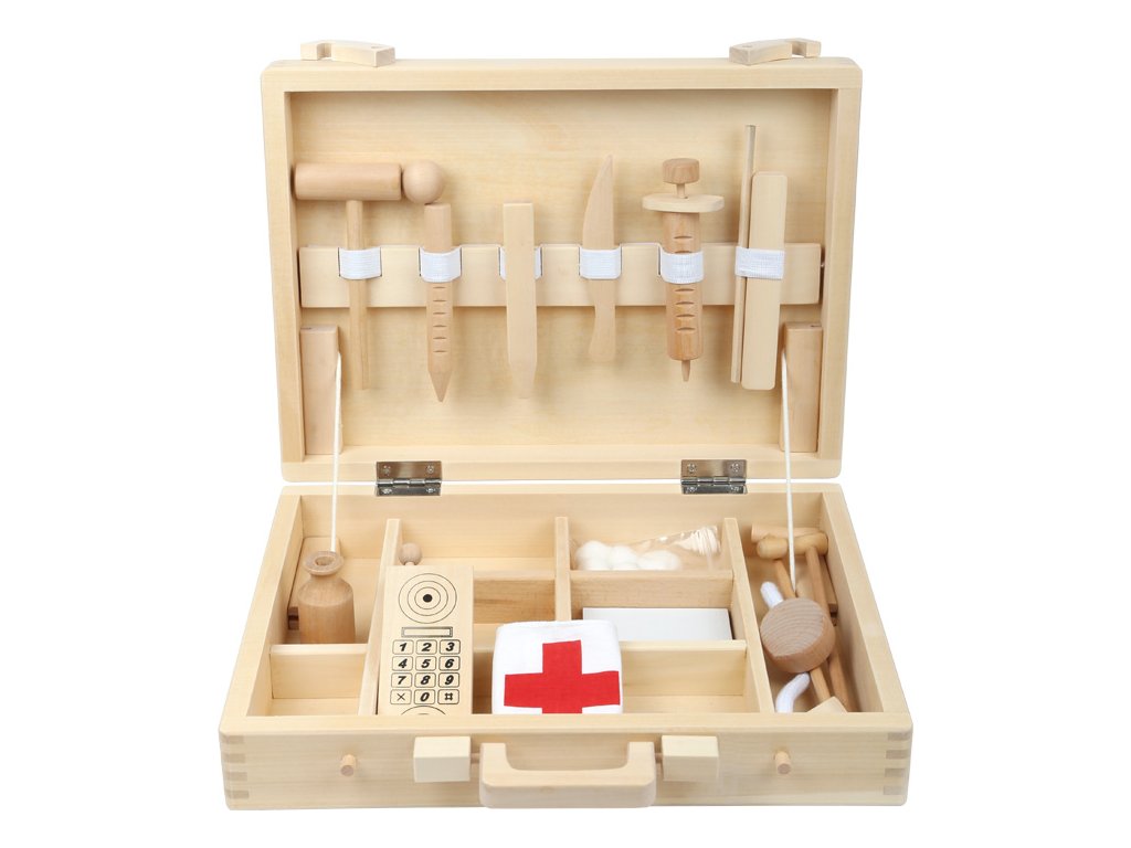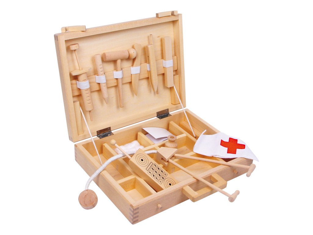 Kvalitní dřevěný kufřík s bohatým obsahem. Tento kufřík obsahuje vše, co lékař potřebuje: různé nástroje, pohotovostní telefon a dokonce i injekční stříkačky. Hlavní vlastnosti: lékařská souprava se spoustou dřevěného lékařského vybavenípružné elastické pásky a oddělené přihrádky udrží léky a lékařské vybavení na místěklasické doktorské symbolypodporuje aktivní hraní a rozvíjí sociální dovednosti