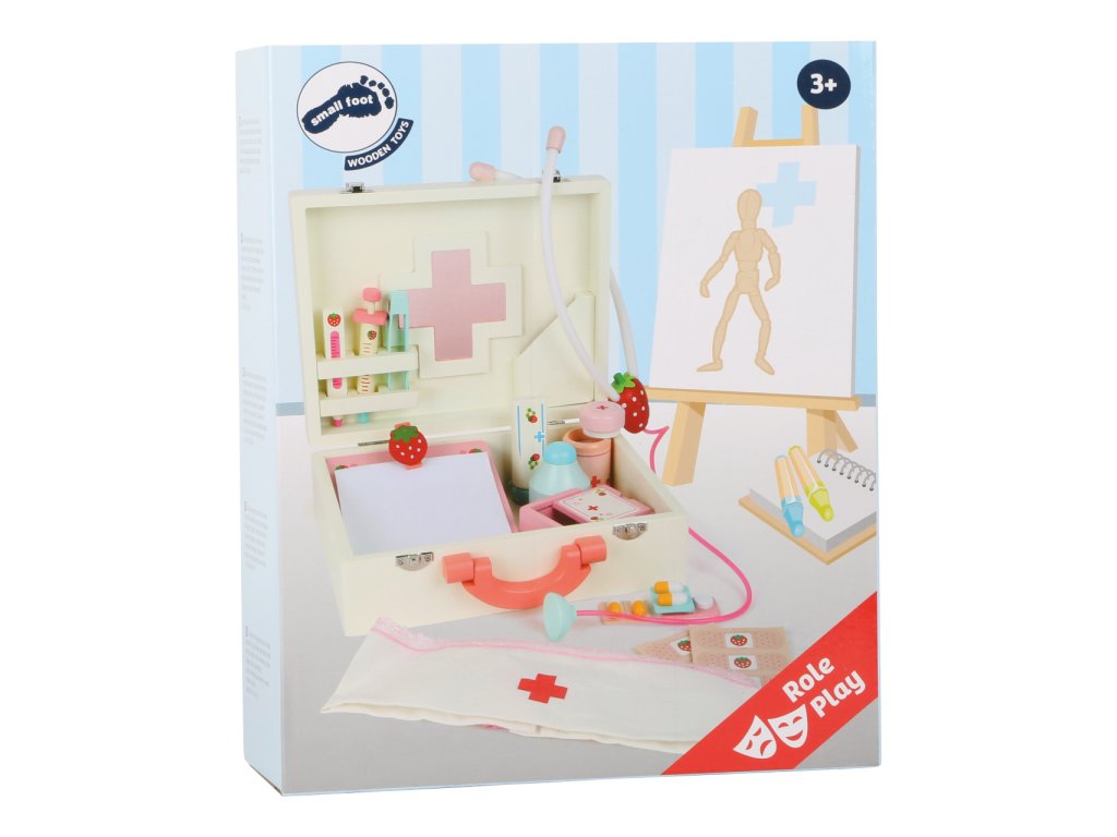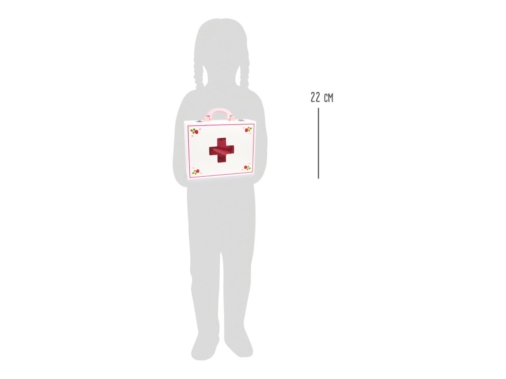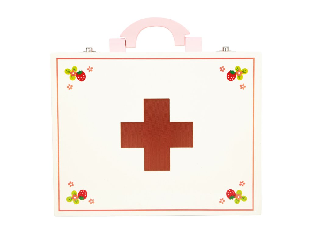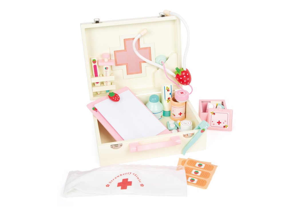 Dřevěný barevný kufřík pro malou ošetřovatelku obsahuje 24 kusů různobarevného dřevěného příslušenství včetně textilní čelenky s červeným křížem. Kufřík obsahuje vše co každý doktor potřebuje - teploměr, stetoskop, injekční stříkačku, masti, léky... Vše vyrobené ze dřeva. Motiv jahody na jednotlivých nástrojích doplňuje veselý design. Hlavní vlastnosti: obsahuje 24 ks lékařských nástrojů a pomůcek podporuje kreativitu a komunikaci